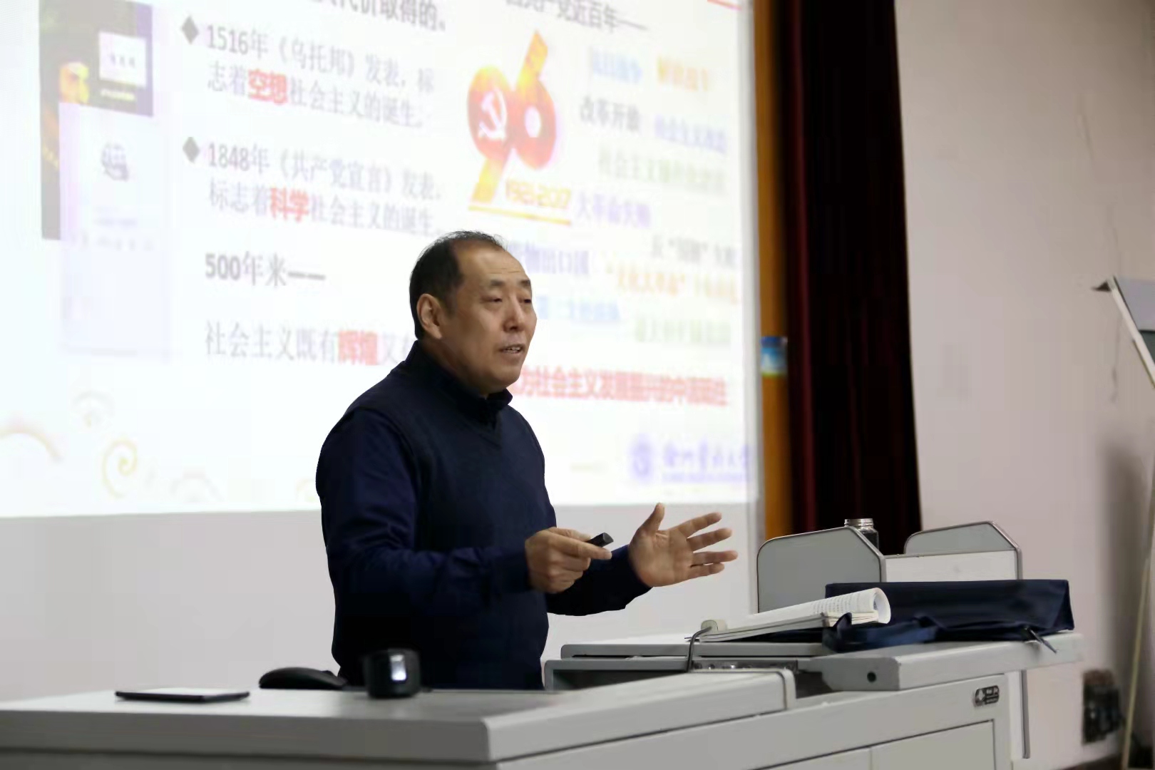 他上课从来不干巴巴地念教材、读课件,总是能很好地做到理论联系实际,充分吸收、利用好活生生的中国特色社会主义实践这个“大思政”,提高教学实效性。
