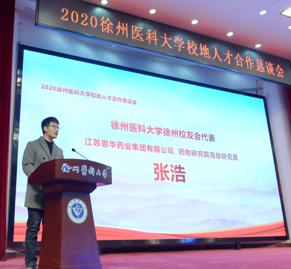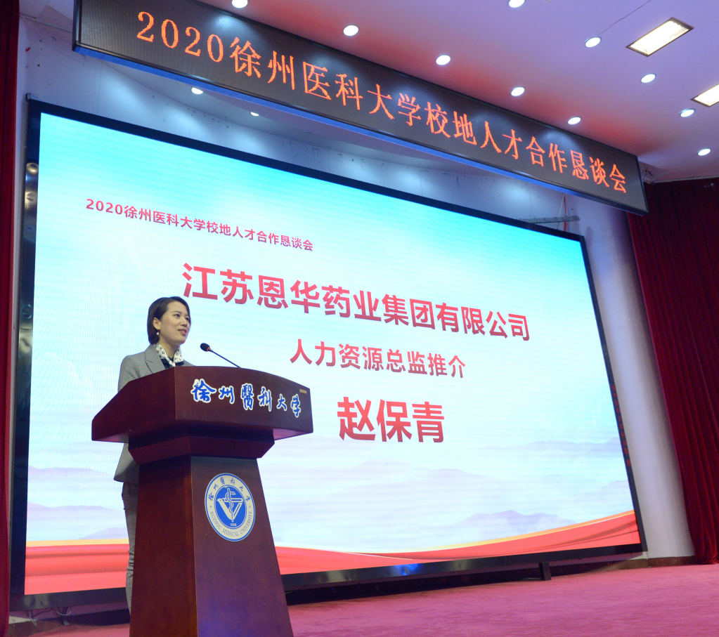 徐州市人才办主任王卫清主持会议并带领同学观看了“走遍五洲,难忘徐州”宣传片。徐州市人社局副局长王翔从徐州的“三个有”——“有更优惠的引才政策,有更优越的创业环境、有更优质的服务保障体系”讲起,向徐医大的学子们作了详细的人才政策推介。徐州市儿童医院党委书记曹军华推介儿童医院人才招引需求。江苏恩华药业集团有限公司人力资源总监赵保青推介企业引才需求;校友马超、张浩分享了在徐就业的经历。
