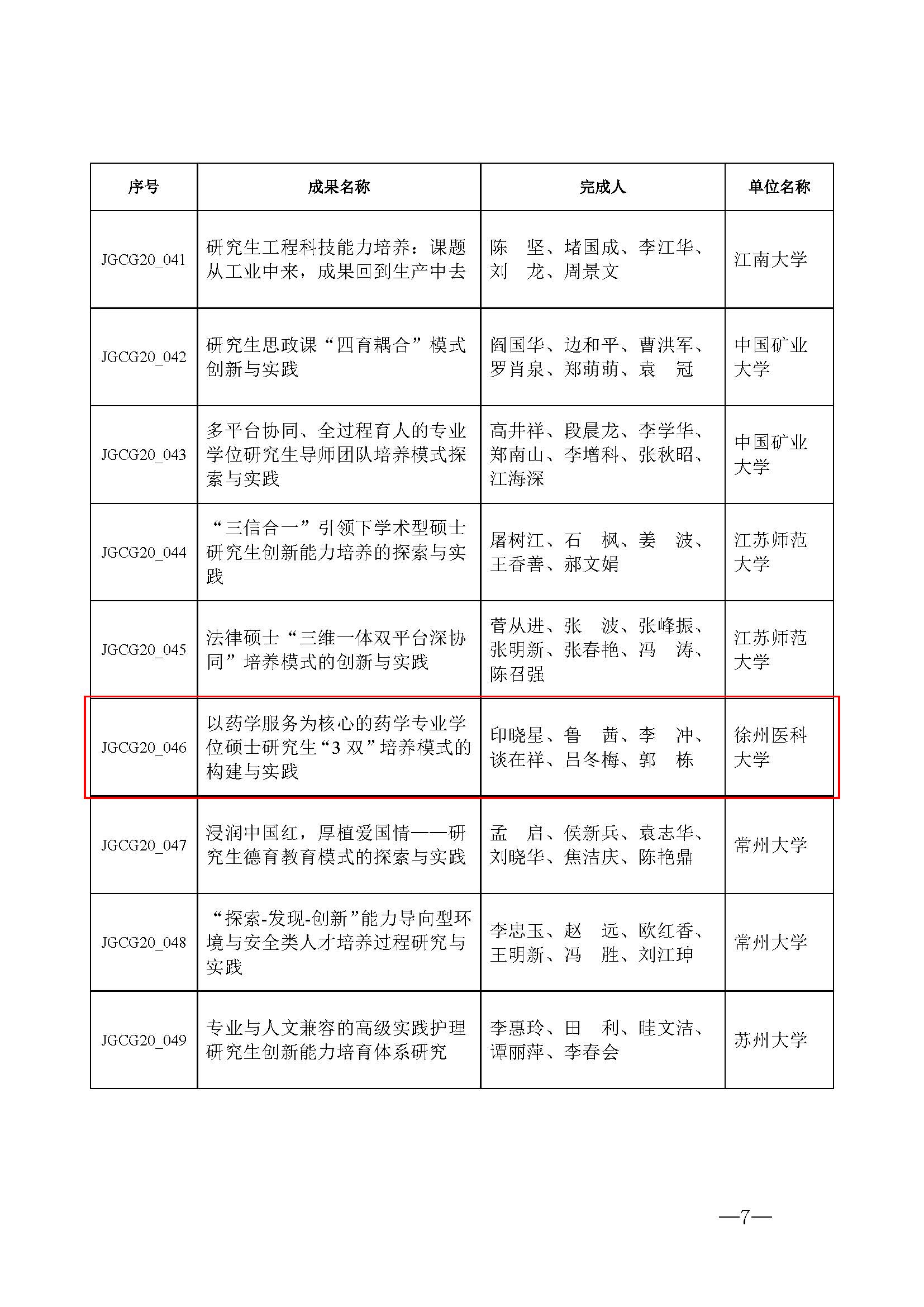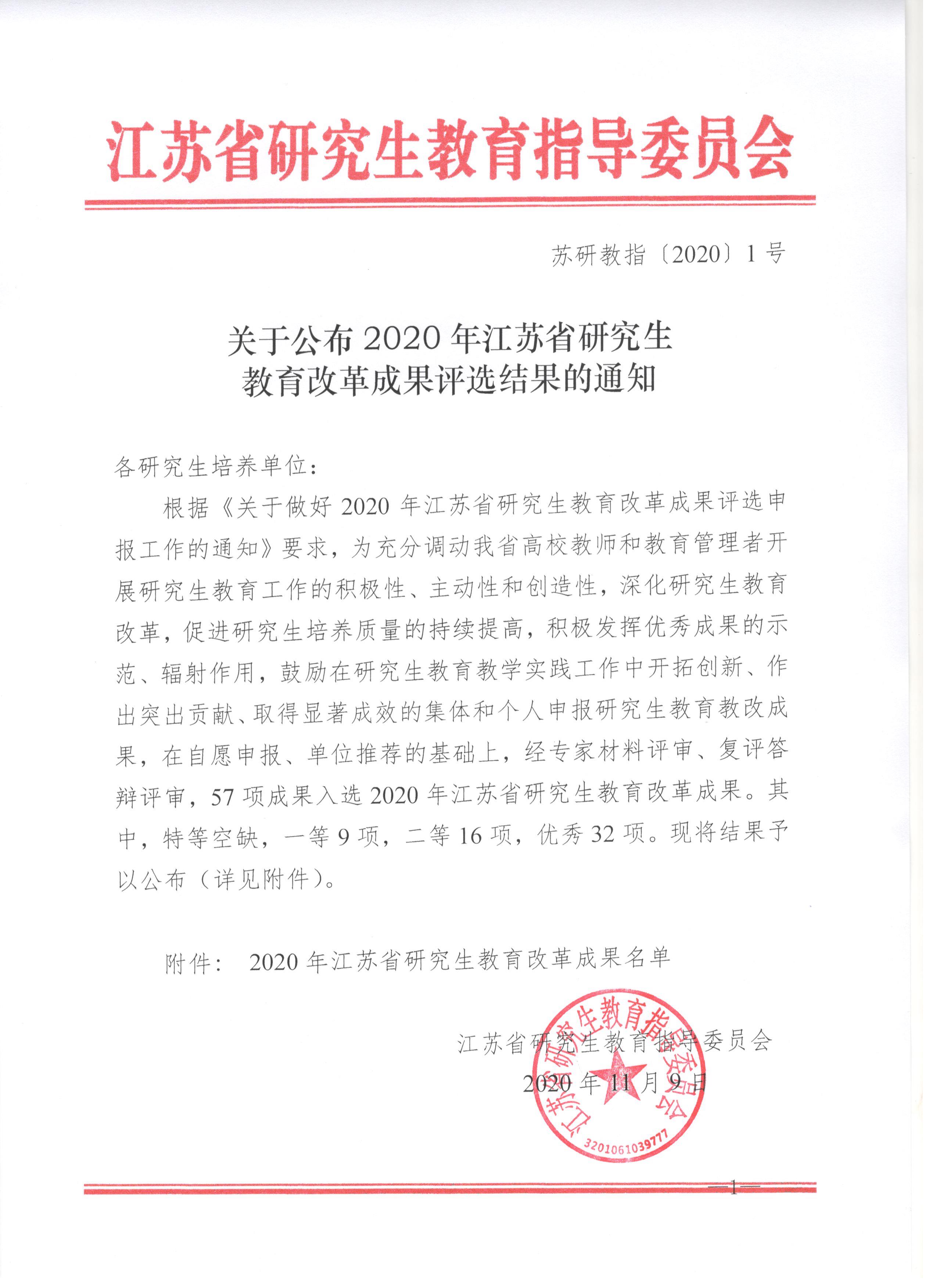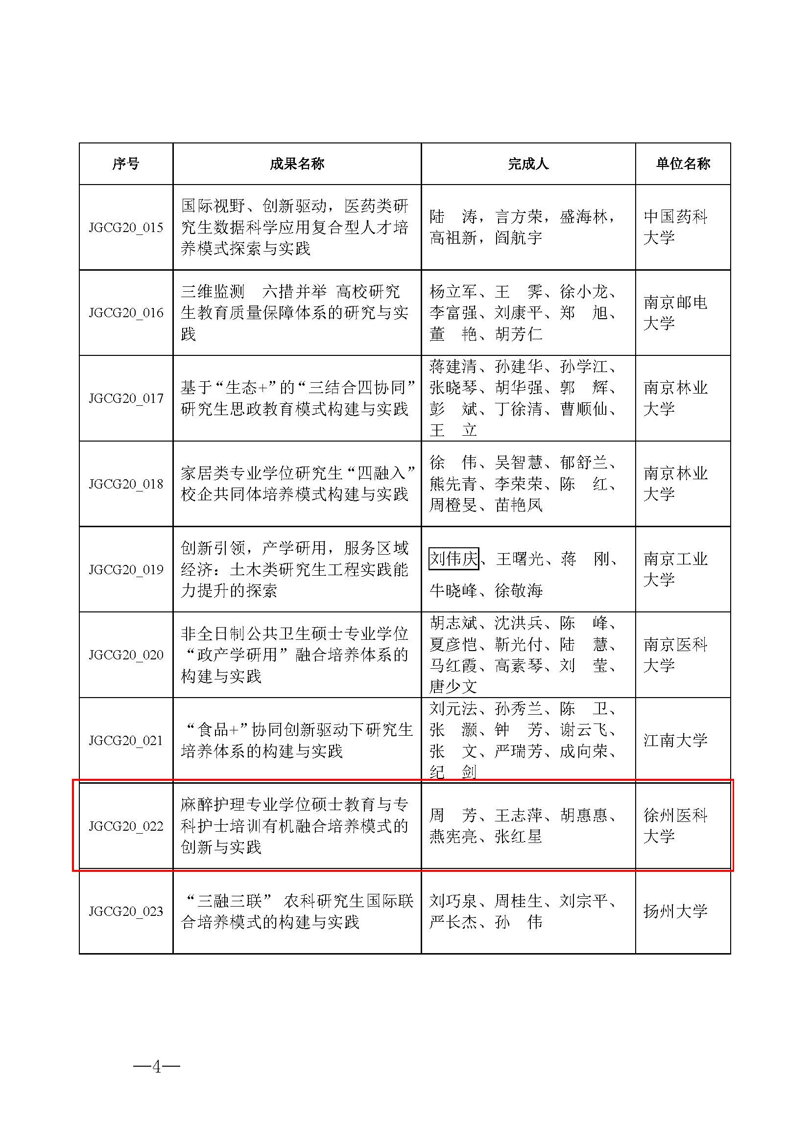 近日,江苏省研究生教育指导委员会下发《关于公布2020年江苏省研究生教育改革成果评选结果的通知》,经专家材料评审、复评答辩等多重环节,捕鱼达人 周芳教授团队申报的《麻醉护理专业学位硕士教育与专科护士培训有机融合培养模式的创新与实践》项目荣获二等奖,印晓星教授团队申报的《以药学服务为核心的药学专业学位研究生“3双”培养模式的构建与实践》项目荣获优秀奖。