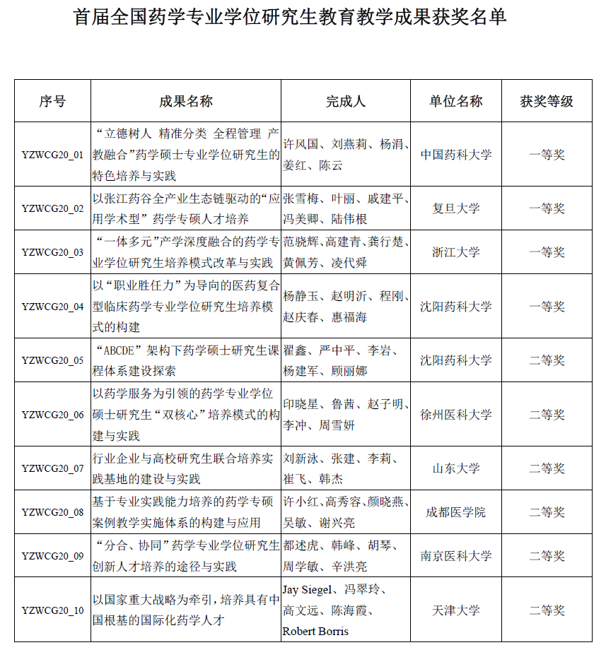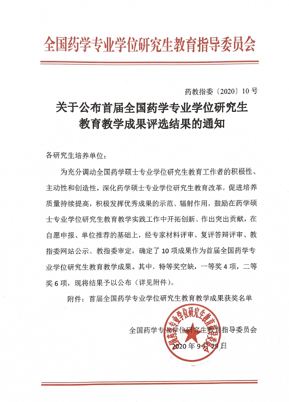 近日,全国药学专业学位研究生教育指导委员会(以下简称“药学教指委”)公布了首届全国药学专业学位研究生教育教学成果奖获奖名单,捕鱼达人 印晓星教授团队申报的《以药学服务为引领的药学专业学位硕士研究生“双核心”培养模式的构建与实践》荣获二等奖。