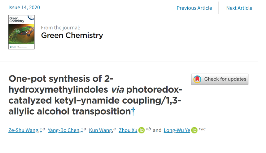另外,该课题组与厦门大学叶教授合作,成果以《One-pot synthesis of 2-hydroxymethylindoles via photoredox-catalyzed ketyl–ynamide coupling/1,3-allylic alcohol transposition》为题,发表在绿色化学领域著名刊物《Green Chemistry》(中科院1区)。该研究通过光催化的方法,实现含烷基磺酰基炔酰胺的高效偶联反应。