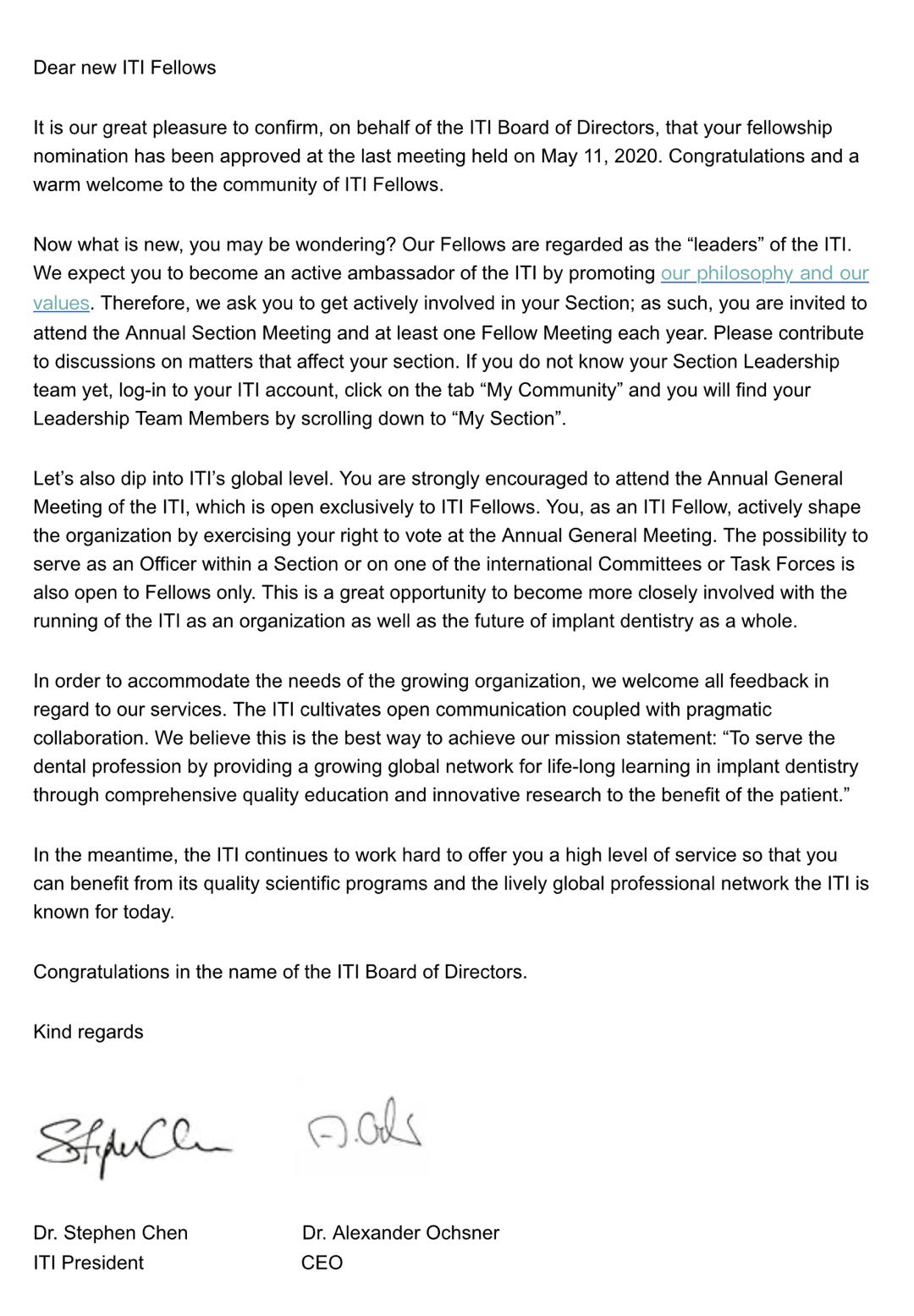 日前,附属口腔医院院长王鹏来教授收到国际口腔种植学会(International Team for Implantology,ITI)主席Dr.Stephen Chen的签名邮件,在2020年5月11日的ITI主席团会议上成功获批为ITI专家组委员(Fellow),成为徐州市第一位国际口腔种植学会专家组委员,充分体现了附属口腔医院口腔种植中心在淮海经济区口腔领域的领导地位,也展示了医院口腔医学中心在临床、教学、科研和学术声望的国际影响力。