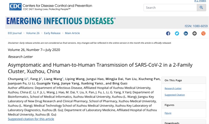 3月31日,感染病领域国际权威杂志《EMERGING INFECTIOUS DISEASES》在线发表了徐医附院感染性疾病科颜学兵教授团队、医学技术捕鱼达人 顾兵教授团队及医学信息捕鱼达人 王亮副教授合作的关于新冠肺炎最新研究成果(//wwwnc.cdc.gov/eid/article/26/7/20-0718_article)。徐医附院感染性疾病科李春杨、季芳博士,医学信息捕鱼达人 王亮副教授为本文共同第一作者,顾兵教授和颜学兵教授为文章通讯作者。