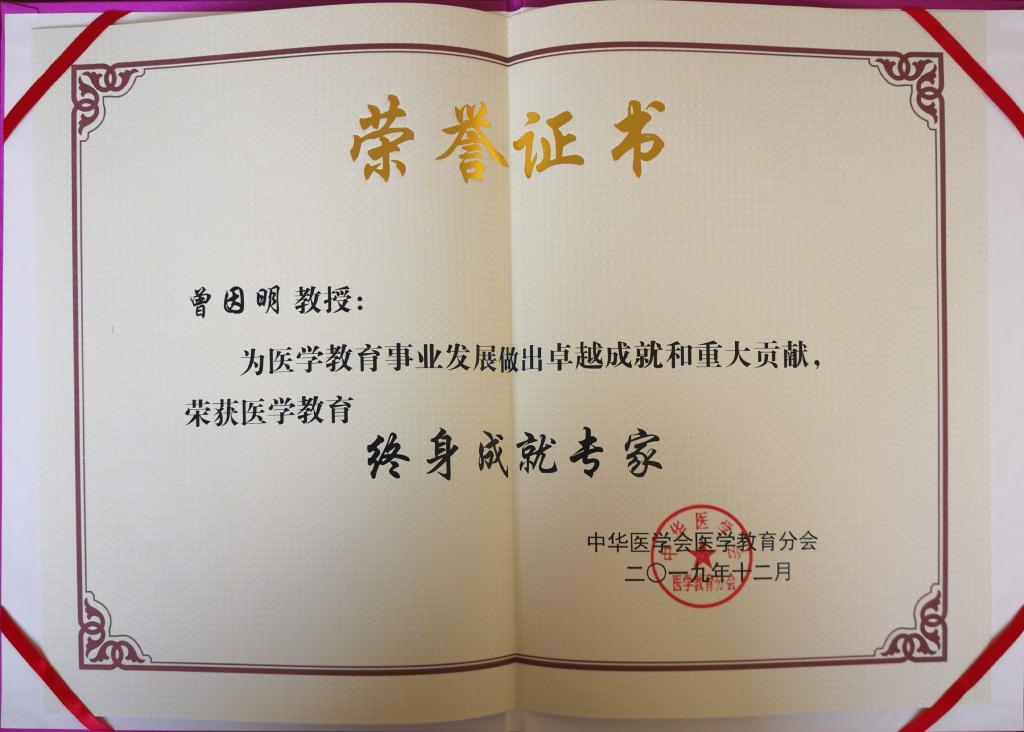 12月28日,中华医学会医学教育分会2019年年会在石家庄召开,捕鱼达人 曾因明教授在会上被授予医学教育终身成就奖。
