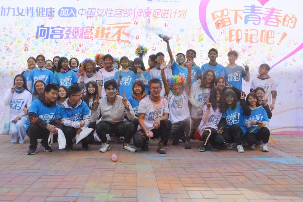 开幕式结束后,500余名运动员开始了彩跑之旅。本次彩跑以青年广场为起点,绕校一周,路程中设置了一系列趣味游戏。在“泡泡海洋”中,同学们穿过绵密的泡泡墙,以表示他们对宫颈癌说不的决心;在“扎破HPV病毒气球”活动中,同学们拿起飞镖,将代表“HPV病毒”的气球一个一个扎破,寓意着远离HPV病毒感染;在“精准钓鱼”、“投壶游戏”中,同学们学习了引起宫颈癌的高危因素、宫颈癌的三级预防等知识;闯过层层关卡,在纷扬的“彩虹雨”下,同学们最终抵达终点,并在活动的手印墙上留下五彩手印,拍照留念。
