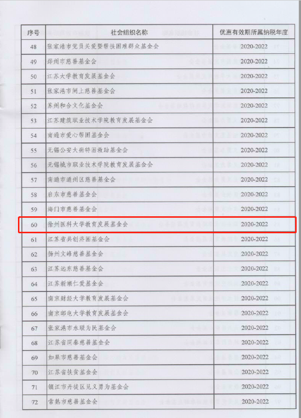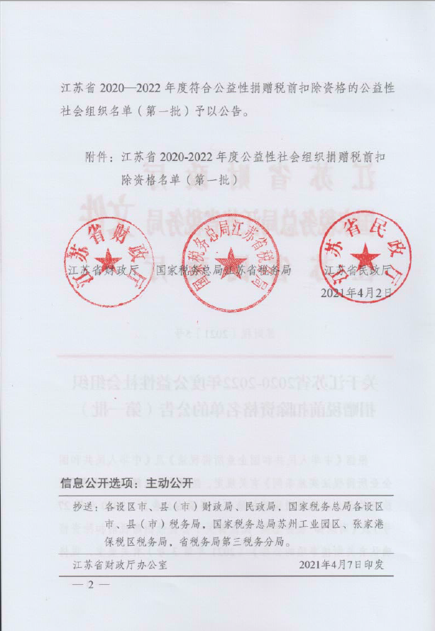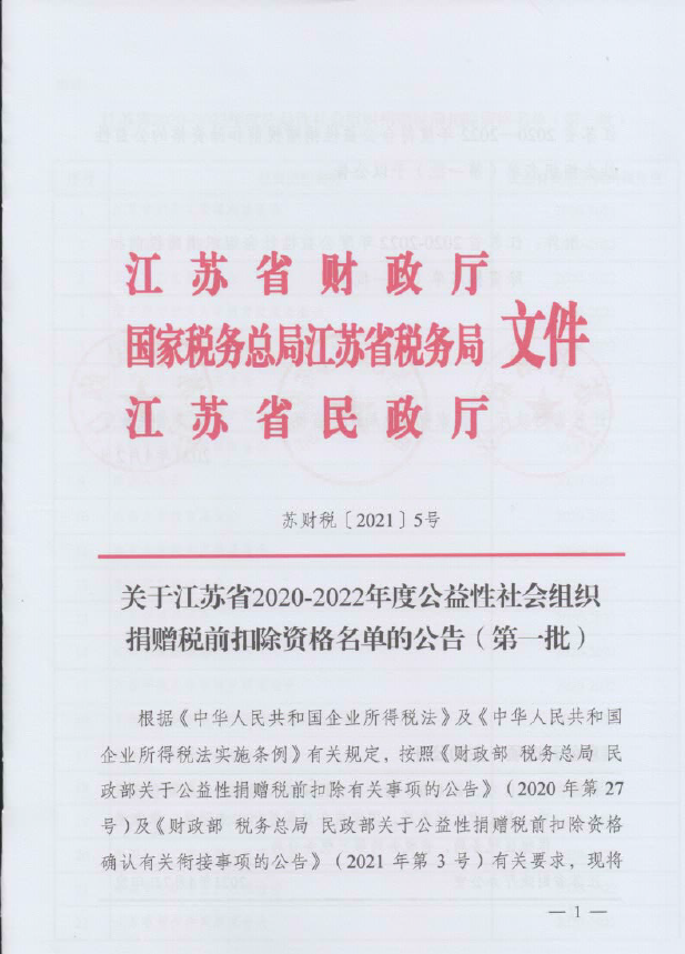 近日,江苏省财政厅、国家税务总局江苏省税务局、江苏省民政厅联合印发《关于江苏省2020-2022年度公益性社会组织捐赠税前扣除资格名单的公告》(第一批)(苏财税〔2021〕5号),捕鱼达人 教育发展基金会再次获得公益性社会组织捐赠税前扣除资格,有效期为三年。