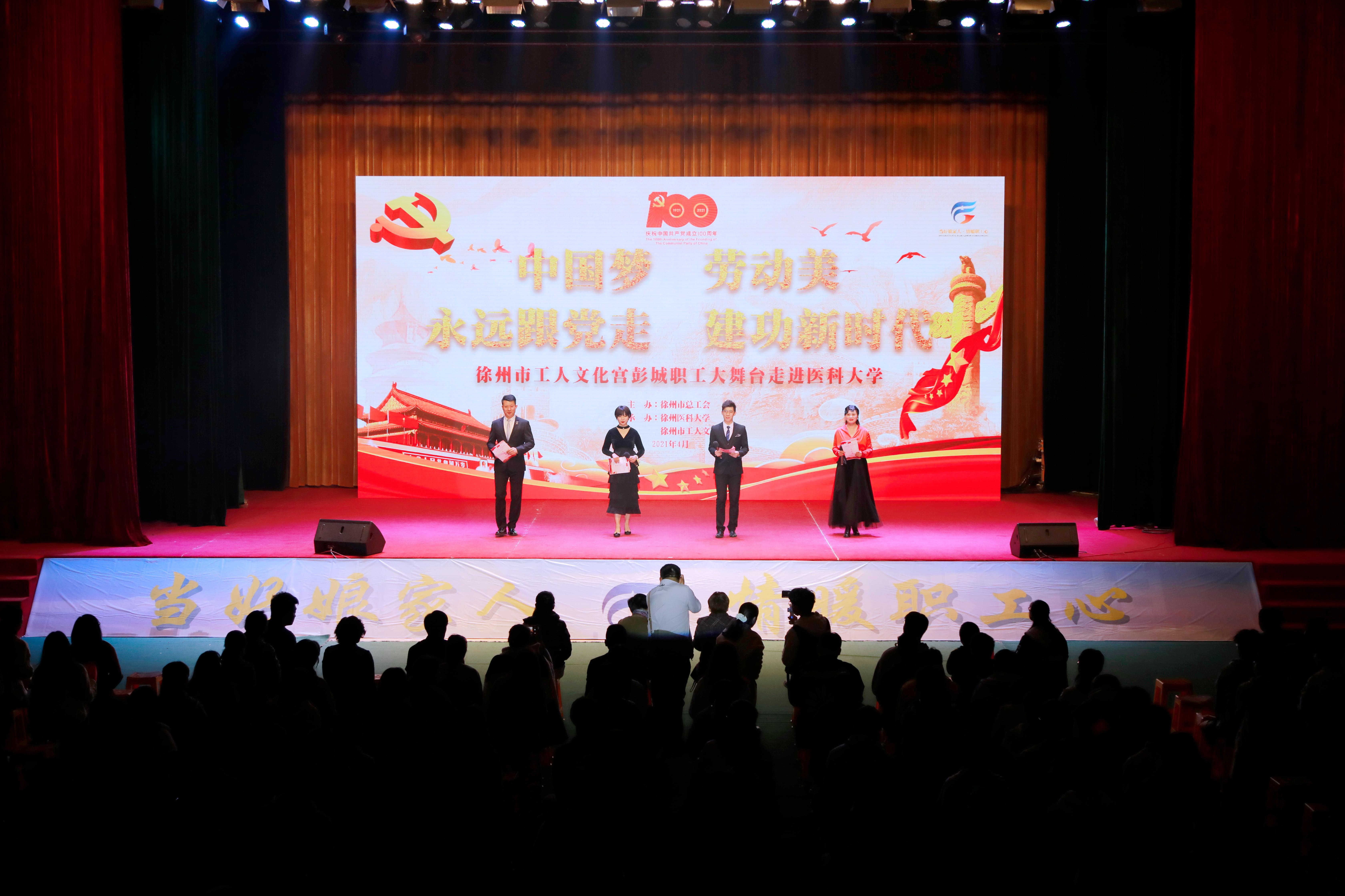 值五一劳动节和五四青年节来临之际,4月20日晚,徐州市总工会、徐州市工人文化宫携“彭城职工大舞台” 庆祝中国共产党成立100周年暨“永远跟党走·建功新时代”首场主题文艺汇演在捕鱼达人 举办。校党委副书记、副校长徐海波,徐州市总工会副主席、党组成员潘华,校工会主席张鸣、副主席刘凌,市工人文化宫主任朱卫东、总工会宣传网络工作部副部长李东丽、市工人文化宫副主任侯峰出席文艺晚会。捕鱼达人 师生近千人到场观看演出。