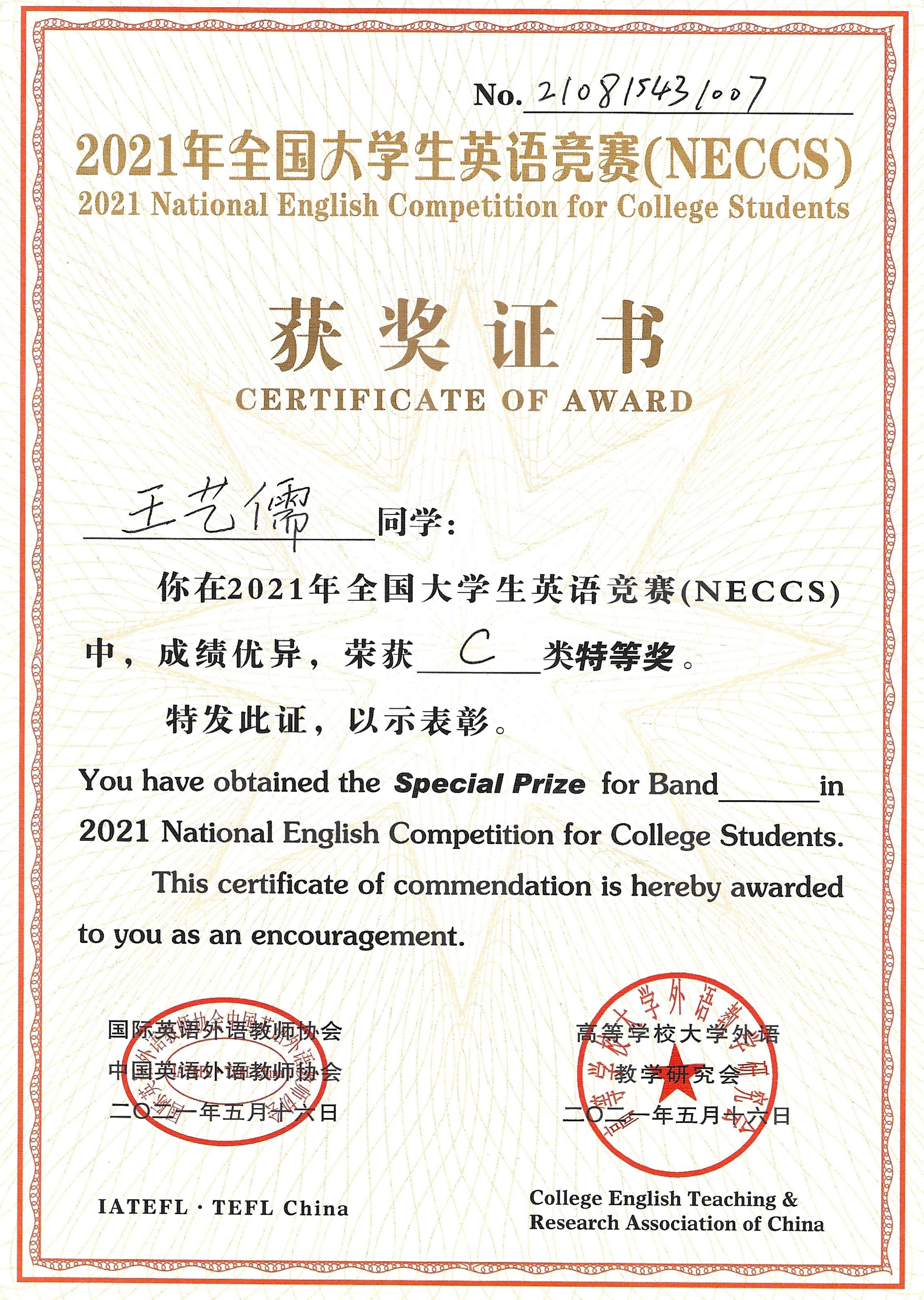 2021年全国大学生英语竞赛江苏省决赛近日于南京落下帷幕。代表捕鱼达人 参赛的9名同学沉着应战,冷静作答,喜获佳绩。王艺儒同学荣获C类特等奖,其他8名同学荣获一等奖。