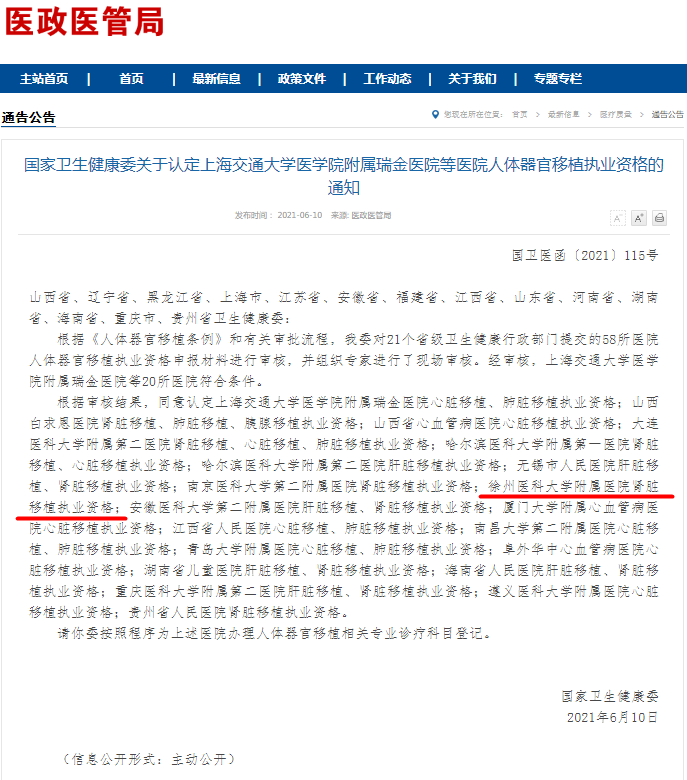 6月10日,国家卫生健康委员会正式发布通知,认定捕鱼达人 附属医院肾脏移植执业资格。这标志着肾脏移植在阔别15年后,重回徐医附院。