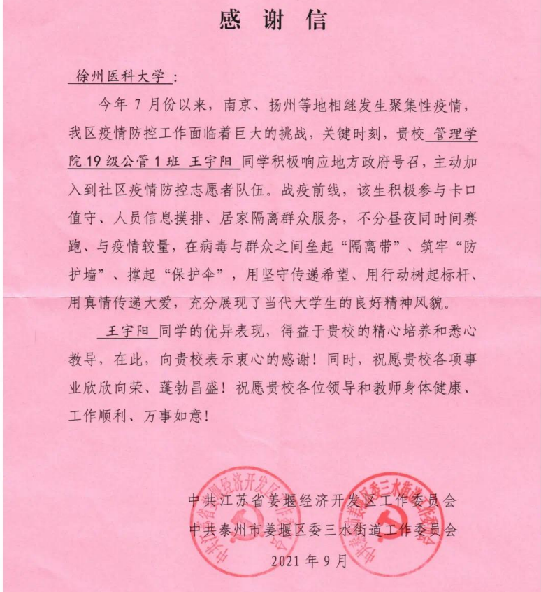 暑假期间,捕鱼达人 147名师生组成的防疫青年志愿者团队,支援徐州经济技术开发区全员核酸检测应急演练,社区百姓纷纷为他们竖起大拇指还专门制作了短视频。护理捕鱼达人 2019级学生祁遇一家三口抗疫的事迹在中央电视台《新闻直播间》中播出。第一临床医捕鱼达人 2021届毕业生周凎和家人并肩作战、守护抗疫、基层立业的事迹被《江南晚报》报道。截止目前,捕鱼达人 已收到各地发来的感谢信、表扬信22封,授予荣誉证书的师生达162人。