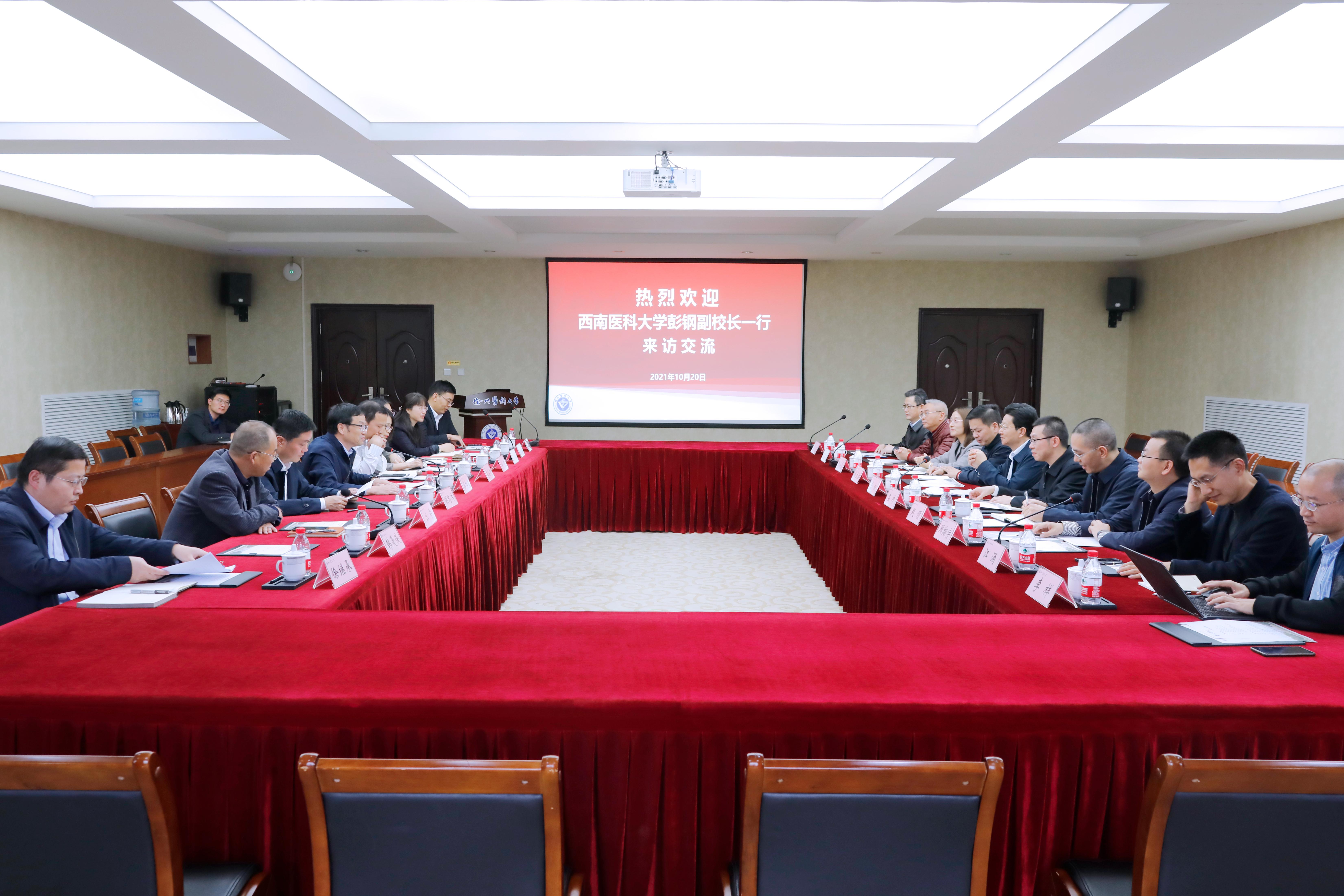 10月20日-21日,西南医科大学党委常委、副校长彭钢率队来捕鱼达人 考察交流。党委常委、副校长蔡红星,党办、发规办、人事处、教务处、教学质量保障与评估中心、科技处、研究生院、麻醉捕鱼达人 、药捕鱼达人 相关负责同志参加座谈会。