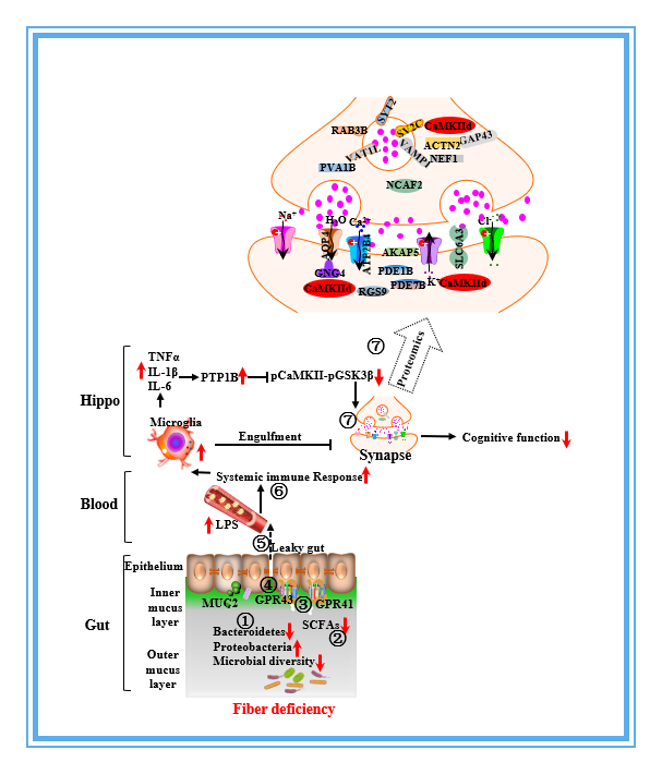 认知障碍是大脑老化和神经退行性疾病的核心特征。由于饮食习惯和社会生活变化,目前我国和其他工业化发达国家的膳食纤维摄入量明显不足。该研究利用菌群代谢产物短链脂肪酸(SCFA)受体GPR41-/- 和GPR43-/-敲除小鼠等多种动物模型,给与长期膳食纤维缺乏饮食,模拟人类持续低纤维摄入,运用蛋白质组学、16S rRNA测序、荧光原位杂交、GC/MS等多种分子生物学、分子免疫学和生物信息学分析技术,揭示了膳食纤维缺乏经由肠道菌群-肠-脑轴引起认知功能下降的机制:膳食纤维缺乏可致肠道菌群紊乱(拟杆菌减少和变形菌增加);进而引起肠道黏膜免疫和紧密连接屏障的改变;菌群代谢产物短链脂肪酸缺乏和脂多糖增多,促使海马小胶质细胞激活、过渡吞噬突触、损伤突触超微结构、引起CaMKIId 及其相关突触蛋白(包括 GAP43 和 SV2C)的缺陷。在补充短链脂肪酸后上述损伤得到逆转。这项研究表明,膳食纤维缺乏饮食通过改变肠道微生物群-海马轴导致认知下降,提示增加膳食纤维摄入量可降低神经退行性疾病的风险。