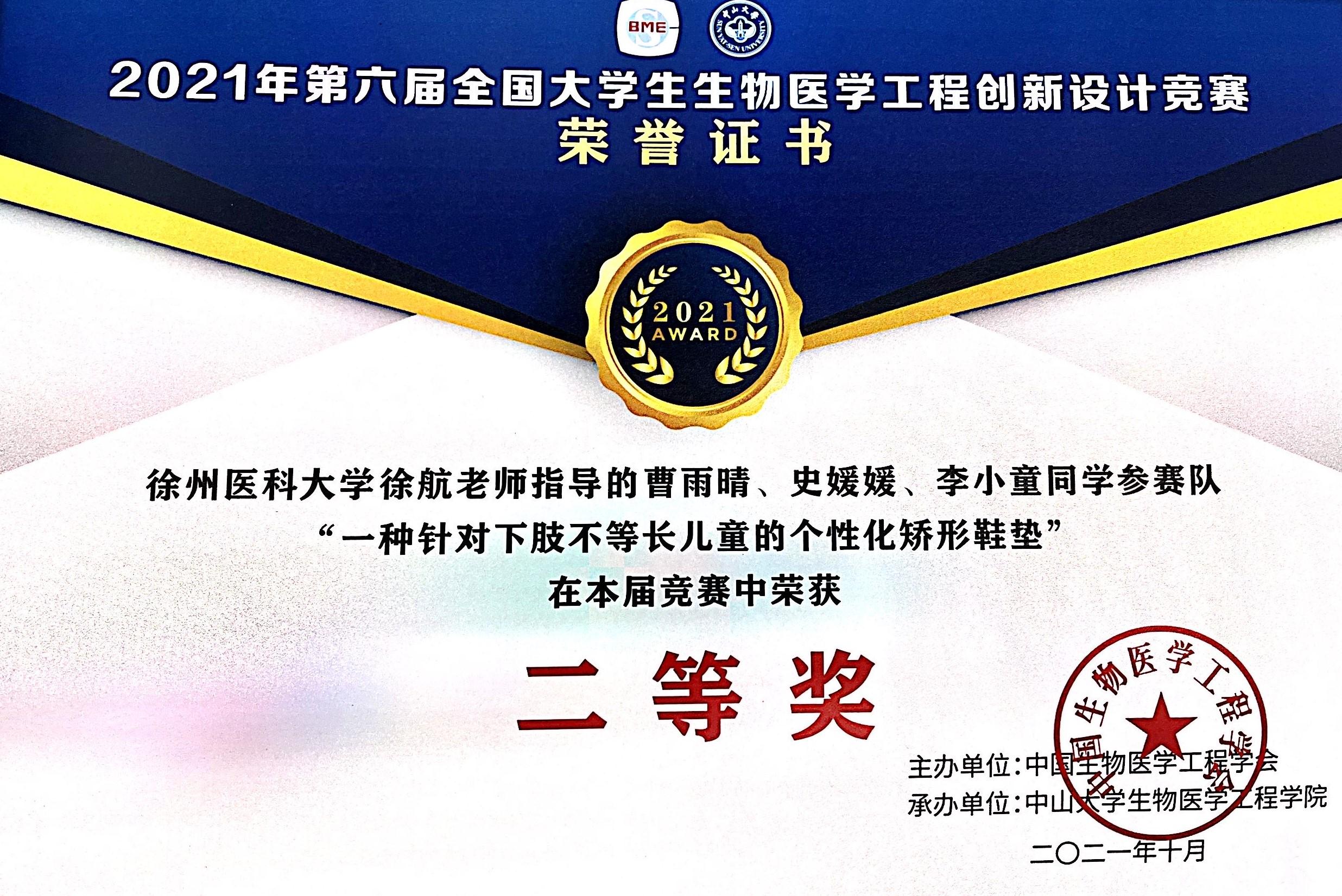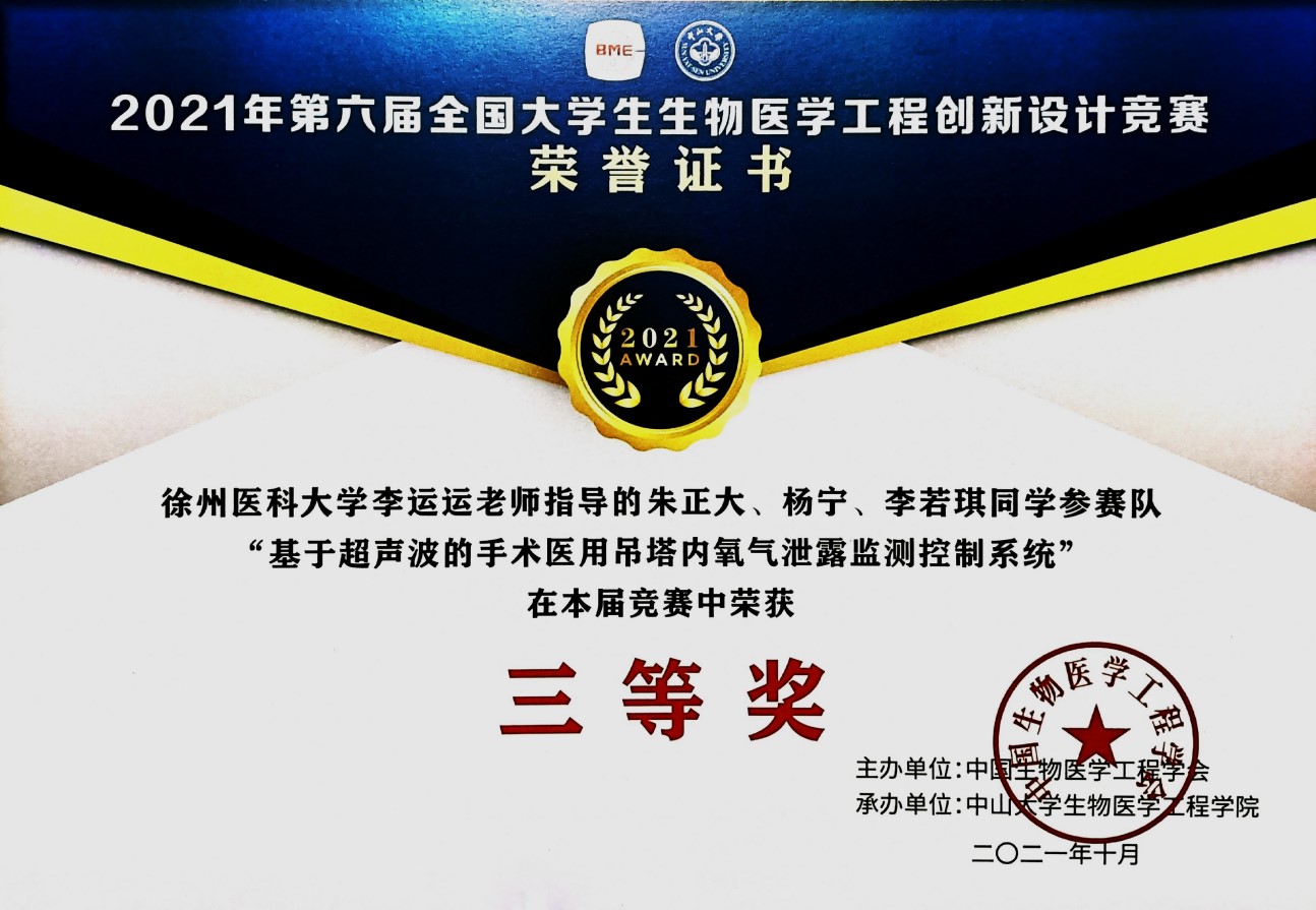 近日,第六届全国大学生生物医学工程创新设计竞赛决赛在中山大学以线上方式举行。捕鱼达人 徐航老师指导的参赛作品“一种针对下肢不等长儿童的个性化矫形鞋垫”(团队成员:曹雨晴、李小童、史媛媛)荣获二等奖;李运运老师指导的参赛作品“基于超声波的手术医用吊塔内氧气泄露监测控制系统”(团队成员:朱正大、杨宁、李若琪)荣获三等奖。