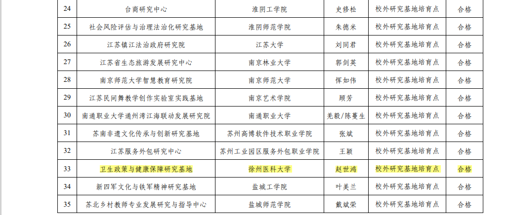 2017年,江苏省教育厅将捕鱼达人 与徐州市卫健委共同申报的人文社会科捕鱼达人 外研究基地(卫生政策与健康保障研究基地)确定为省级高校人文社会科捕鱼达人 外研究基地培育点。经过五年建设,根据苏教办社政函〔2022〕12号文,捕鱼达人 人文社会科捕鱼达人 外研究基地经江苏省教育厅考核验收合格,予以公布。