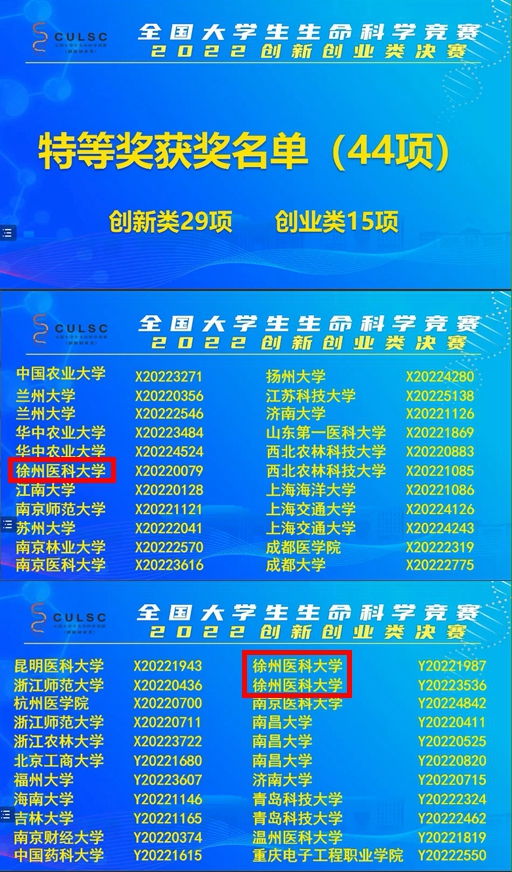 凭借着各团队的优异表现,药捕鱼达人 《居桢香缘——优质中药种苗选育领航者》(指导教师:张春平、袁子桐)、麻醉捕鱼达人 《靶向TRPML1通道抑制自噬治疗肿瘤的作用及分子机制研究》(指导教师:王午阳、邢燕红)、第一临床医捕鱼达人 《引星科技——骨组织工程引航者》(指导教师:陈宏亮、孙森)3个项目荣获国赛特等奖;第二临床医捕鱼达人 《急先锋——公共化心肺复苏辅助装置的首创者》(指导教师:燕宪亮、张颖)、影像捕鱼达人 《环影医疗——脑胶质瘤智能诊断开拓者》(指导教师:巩萍、陈洁)等10个项目荣获国赛一等奖;生命科学捕鱼达人 《愈可肤——手消产品低醇化领域的先行者》(指导教师:刘毅、朱慕春)等8个项目荣获国赛二等奖;医学信息与工程捕鱼达人 《屏踪“质”影——胶质瘤基因突变智能诊断系统》(指导教师:朱红、唐璐)等9个项目荣获国赛三等奖。