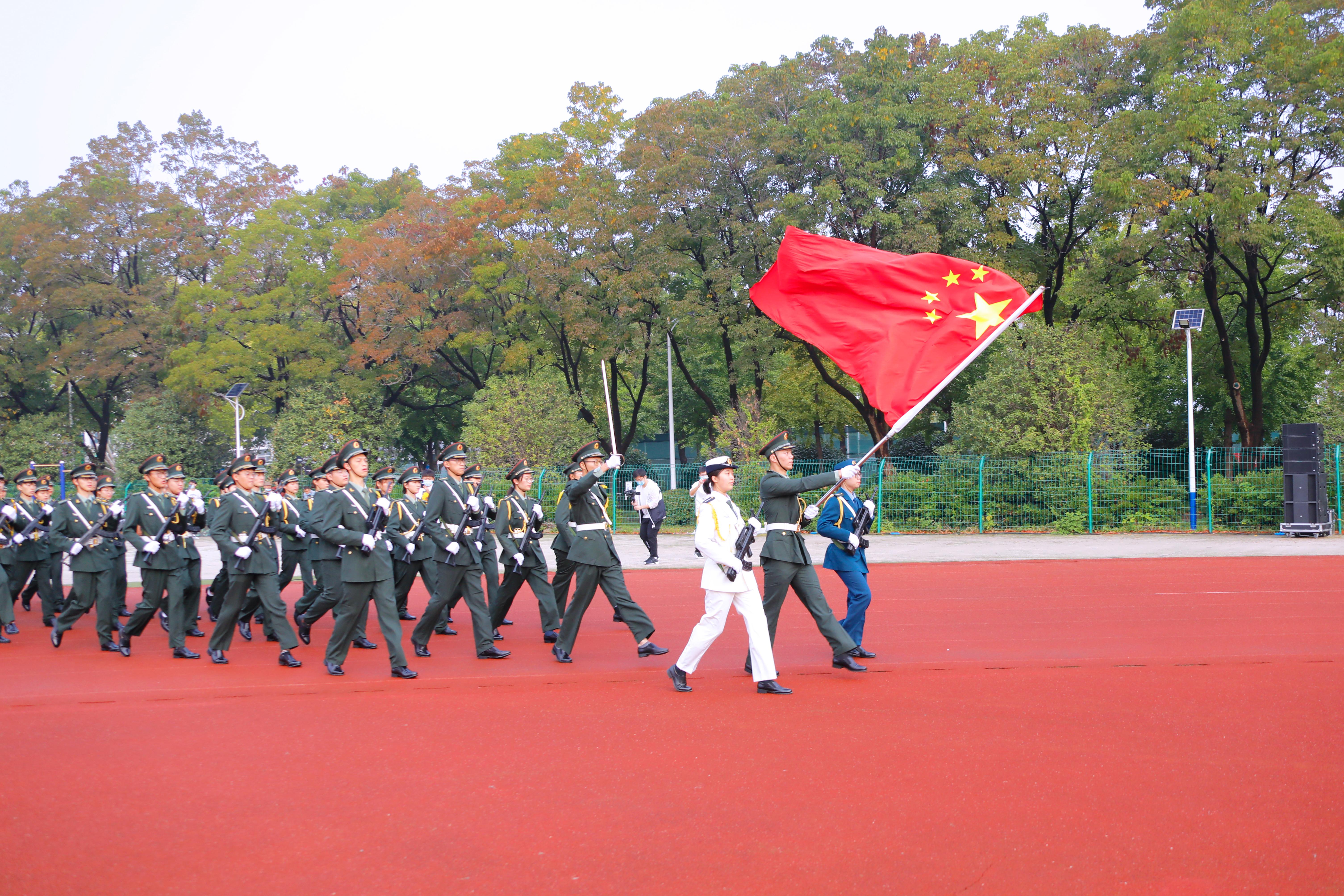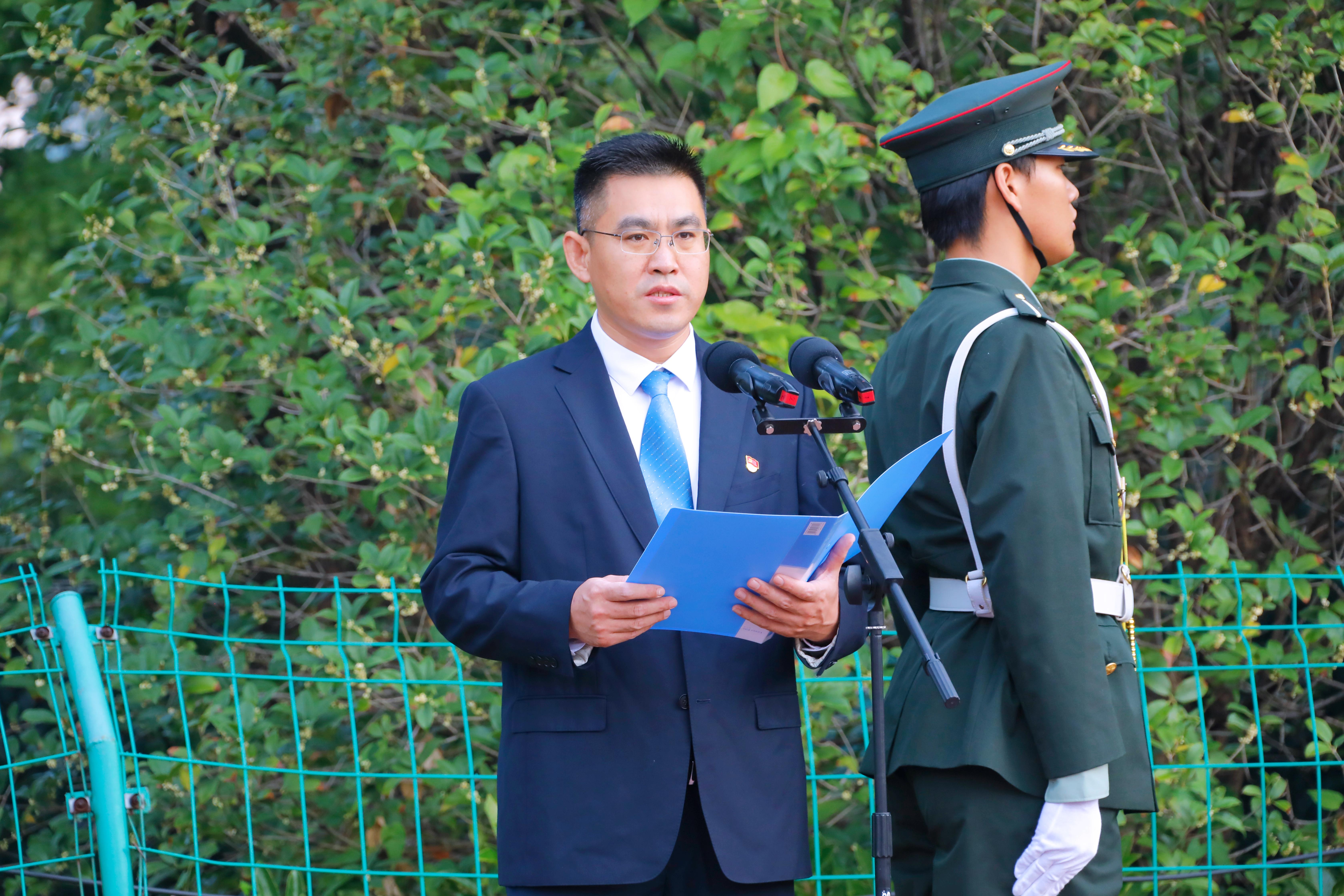 上午7点,升旗仪式开始。在师生们的注目中,国旗护卫队迈着铿锵的步伐,护卫着国旗走上升旗台。全体师生面向国旗肃立致礼。伴随着《义勇军进行曲》,升旗手振臂一挥,五星红旗冉冉升起,在熠熠晨光中迎风飘扬。