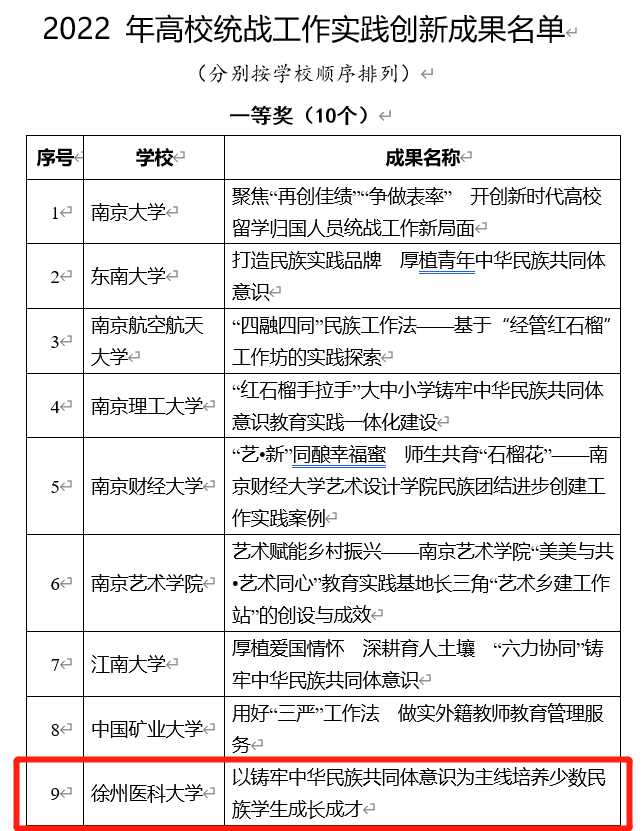 近日,江苏省委教育工委公布了2022年高校统战工作实践创新成果遴选结果,经捕鱼达人 申报、专家评选,全省高校共遴选出76个奖,其中一等奖10个,二等奖22个,三等奖37个,优秀奖7个。捕鱼达人 积极组织申报的《以铸牢中华民族共同体意识为主线培养少数民族学生成长成才》获江苏省委教育工委2022年高校统战工作实践创新成果一等奖,实现统战工作成果新突破。