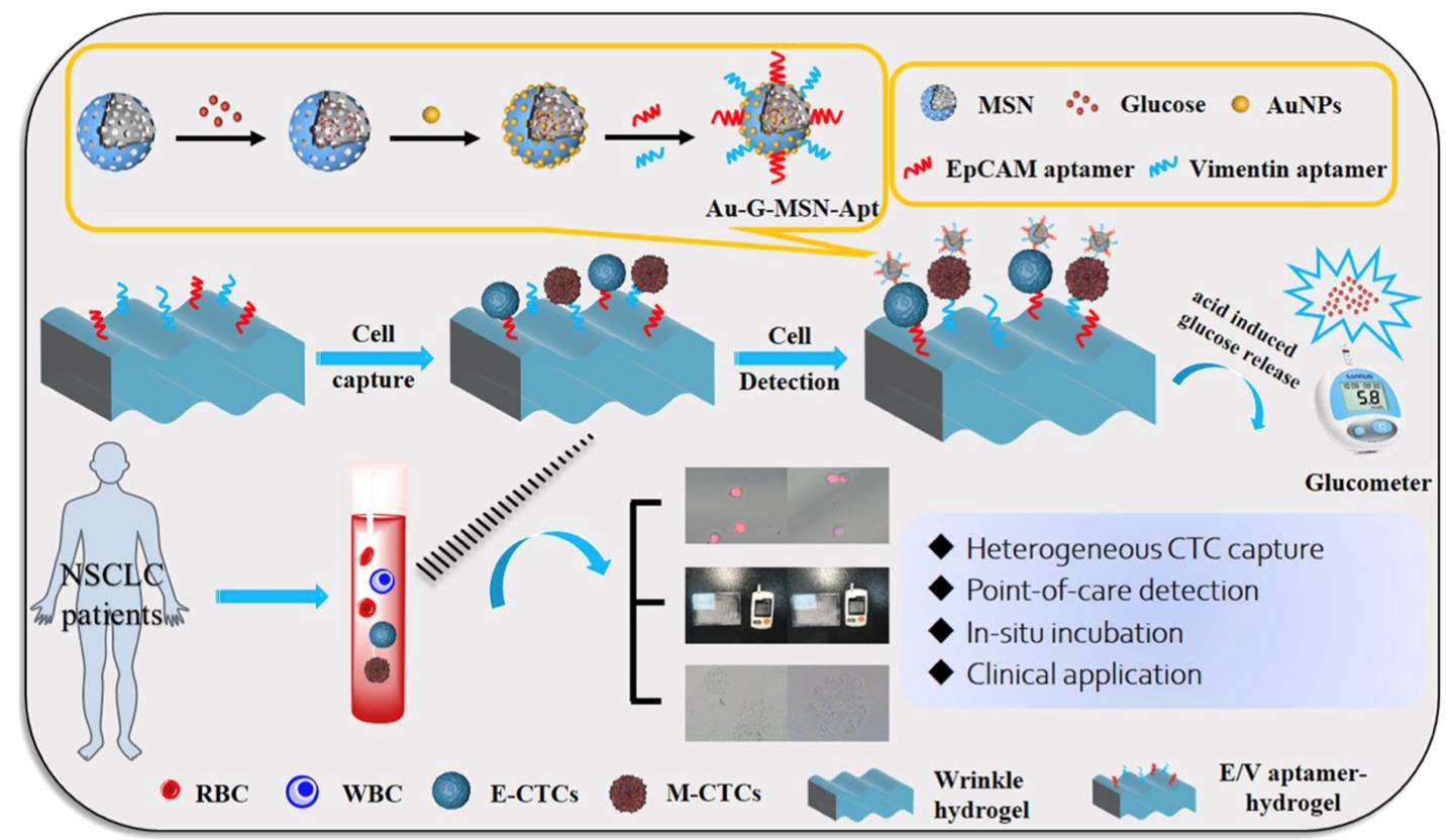 本文通过研制高性能水凝胶纳米材料,作为CTCs的捕获界面,联合修饰上皮细胞粘附分子和波形蛋白适配体,对上皮和间质来源CTCs进行同步识别,显著提高了异质型CTCs的捕获效率(肺癌CTCs的捕获效率均可达到90%以上)。利用市售血糖仪,通过检测探针中释放出来的葡萄糖分子,对捕获到的CTCs进行了高精准的快速定量分析。实验中还进一步发现,水凝胶捕获界面的高生物相容性,允许被捕获的CTCs在其表面进行原位培养,避免了细胞释放过程导致的细胞活力受损,从而影响下游分析。上述工作的开展,为恶性肿瘤的早期诊断和精准治疗提供了一种新的应用解决方案,展现出巨大的临床应用潜力。
