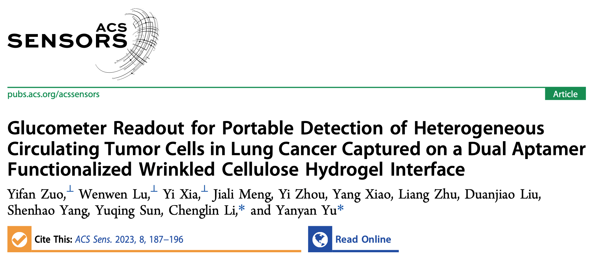 近日,化学领域国际权威期刊《ACS Sensors》(中科院一区TOP期刊,IF 9.618)以“Glucometer readout for portable detection of heterogenous circulating tumor cells in lung cancer captured on dual aptamer functionalized wrinkle cellulose hydrogel Interface”为题在线发表了捕鱼达人 药捕鱼达人 本科生科创团队最新研究成果。论文报道了一种能够高效捕获及检测异质型循环肿瘤细胞(CTCs)的新型快速分析方法。论文第一作者为2019级临床药学专业本科生左益凡。参与完成的本科生有2019级临床药学专业陆雯雯、夏亦、孟加利、周艺。药捕鱼达人 药物分析教研室于妍妍教授为该论文通讯作者,捕鱼达人 为唯一完成单位。