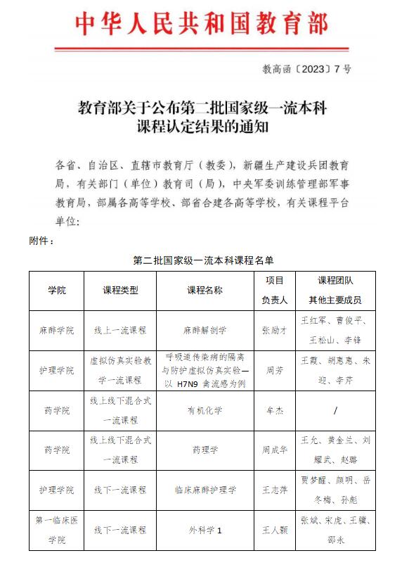 近日,教育部公布第二批国家级一流本科课程认定结果,捕鱼达人 《麻醉解剖学》等6门课程入选国家级一流本科课程,包括线上一流课程1门、线下一流课程2门、线上线下混合式一流课程2门、虚拟仿真实验教学一流课程1门。一流本科课程建设是教育部坚持立德树人根本任务,深化高等教育教学改革,提高人才培养质量的重要举措。根据《教育部关于一流本科课程建设的实施意见》和《教育部办公厅关于开展第二批国家级一流本科课程认定工作的通知》精神,捕鱼达人 紧紧围绕立德树人根本任务,统筹推进课程建设工作,逐步构建起“国家-省-校”三级一流课程建设体系,为提升捕鱼达人 人才培养质量奠定坚实的基础。