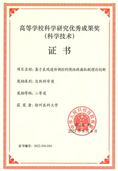 近日,教育部高等捕鱼达人 科学研究优秀成果奖获奖结果公布并颁发证书,捕鱼达人 麻醉捕鱼达人 曹君利教授团队“基于表观遗传调控的慢性疼痛机制理论创新”项目荣获自然科学二等奖(获奖人:曹君利、潘志强、周成华、印晓星、张铭、薛洲亚、朱丽娇、李国芳、郝凌云)。该研究成果奖由麻醉捕鱼达人 和药捕鱼达人 联合申报。