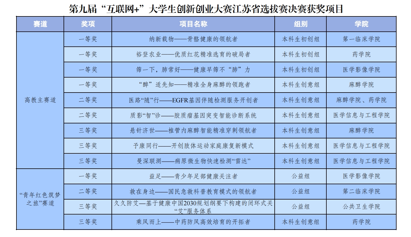 江苏省“互联网+”大学生创新创业大赛是全省影响力最大的双创盛会,是“三位一体”统筹推进教育、科技、人才工作,推进职普融通、产教融合、科教融汇的生动实践,是深化高校创新创业教育改革、促进高校学生全面发展的重要平台。近年来,捕鱼达人 立足学生创新创业成长需求,不断完善双创教育教学体系,加强专创融合人才培养,积极引导广大徐医青年投入科学创新实践,为科创育人助力,为科创成果添彩。