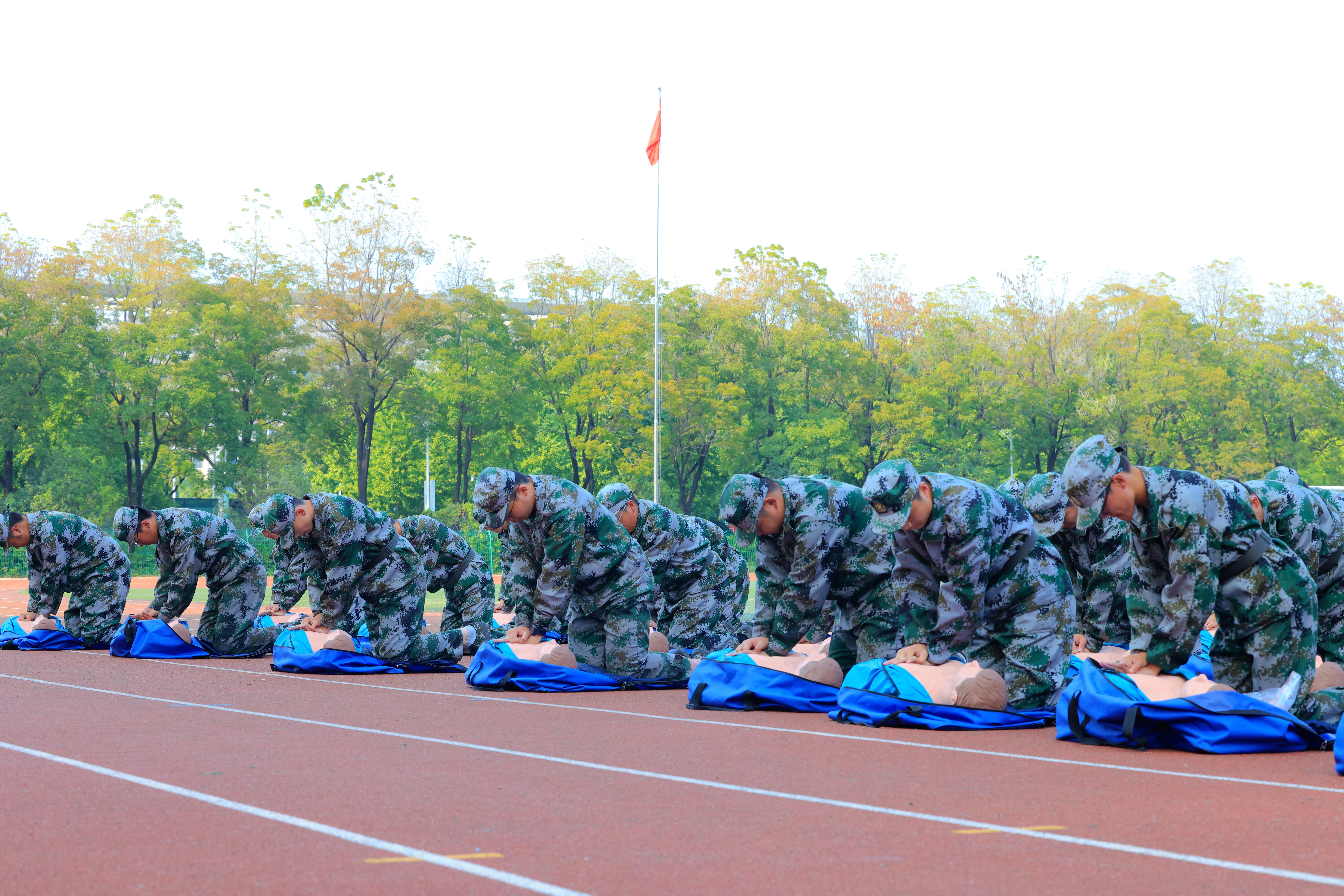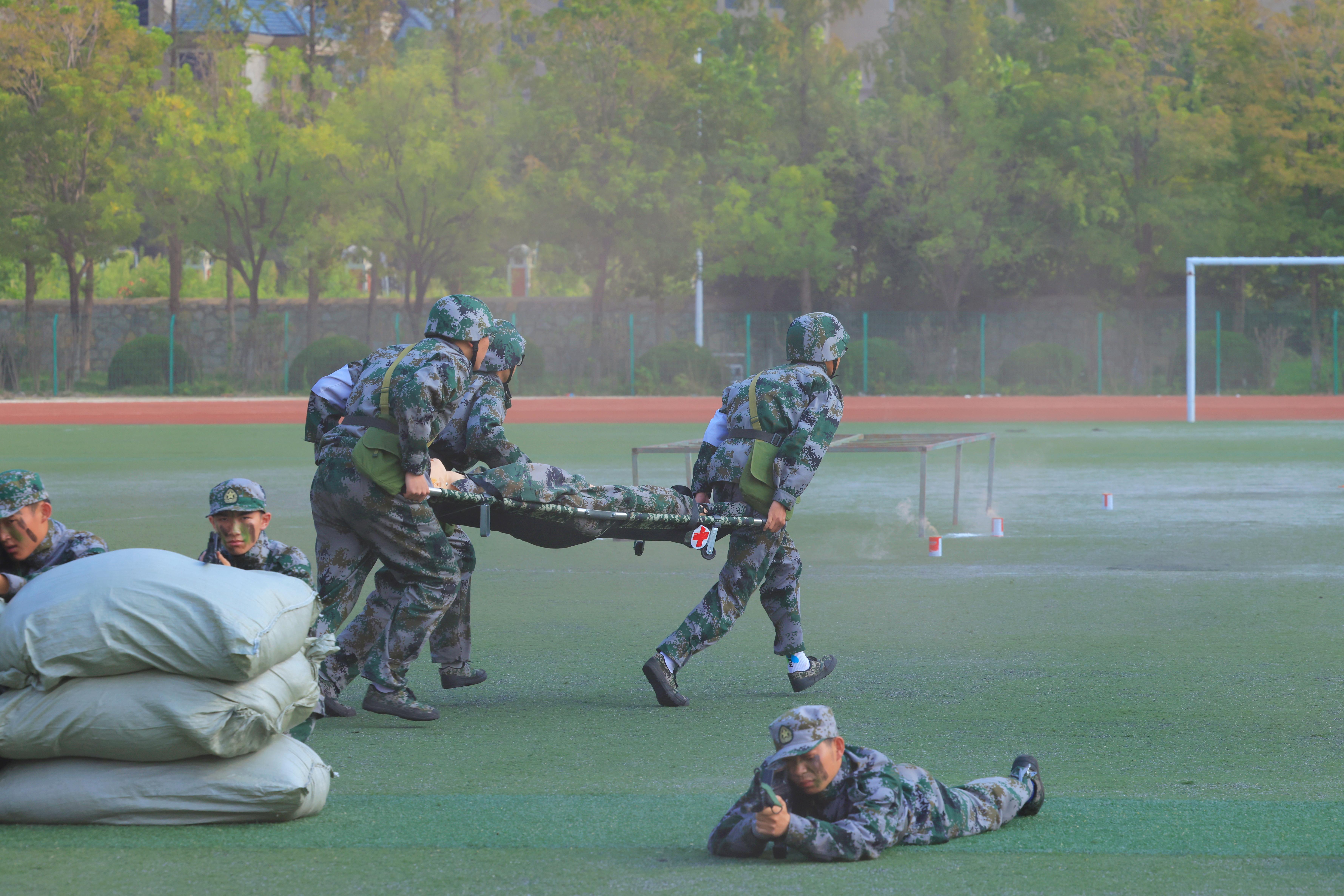 大会在嘹亮的中华人民共和国国歌中拉开帷幕。军训汇报展演部分主要包括分列式方阵检阅、格斗术、心肺复苏、战伤救护及战术演练。伴随着铿锵有力的分列式进行曲,20个分列式方阵的同学们迈着整齐划一的步伐、喊着嘹亮的口号从主席台前依次走过,以饱满的精神面貌接受检阅。干净利落的格斗术、规范标准的心肺复苏、整齐划一的战伤救护、紧张热血的战术演练赢得了现场阵阵掌声。经过2周快节奏、高强度的军训,2700余名参训新生用崭新的面貌展现出了新时代徐医学子朝气蓬勃、积极向上的青春风采。