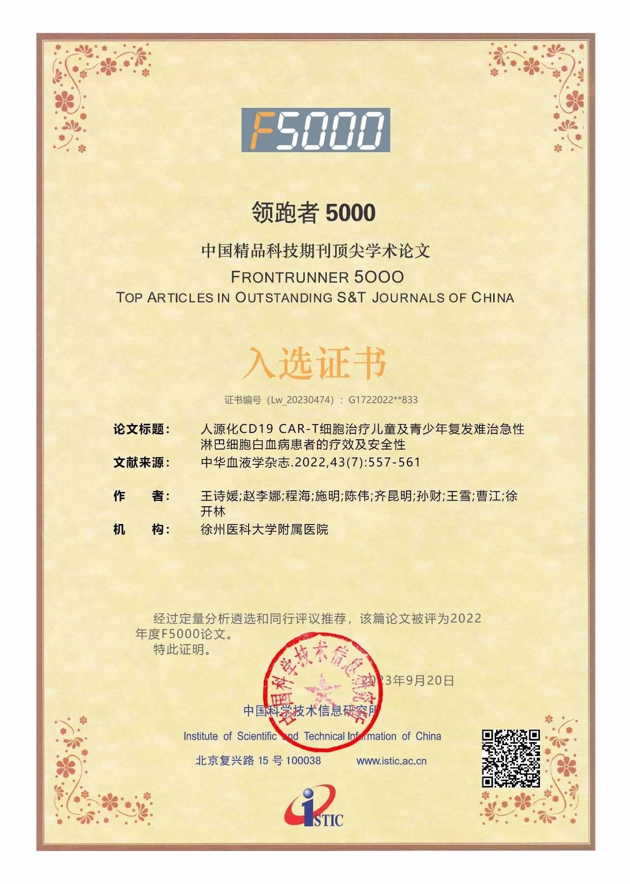 9月20日,科技部中国科学技术信息研究所发布了2022年度“领跑者5000—中国精品科技期刊顶尖学术论文(F5000)”获奖名单。捕鱼达人 附属医院血液科曹江教授团队发表在《中华血液学杂志》2022年第7期的论文《人源化CD19 CAR-T细胞治疗儿童及青少年复发难治急性淋巴细胞白血病患者的疗效及安全性》入选。