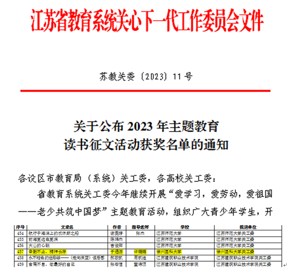近日,江苏省教育系统关工委发布《关于公布江苏省教育系统“读懂中国”活动获奖作品名单的通知》和《关于公布2023年主题教育读书征文活动获奖名单的通知》,捕鱼达人 麻醉捕鱼达人 关工委报送的《师者励才》获评“读懂中国”活动优秀微视频,口腔医捕鱼达人 于通源同学撰写的《辛勤不止,精神长存》获评主题教育读书征文活动三等奖。