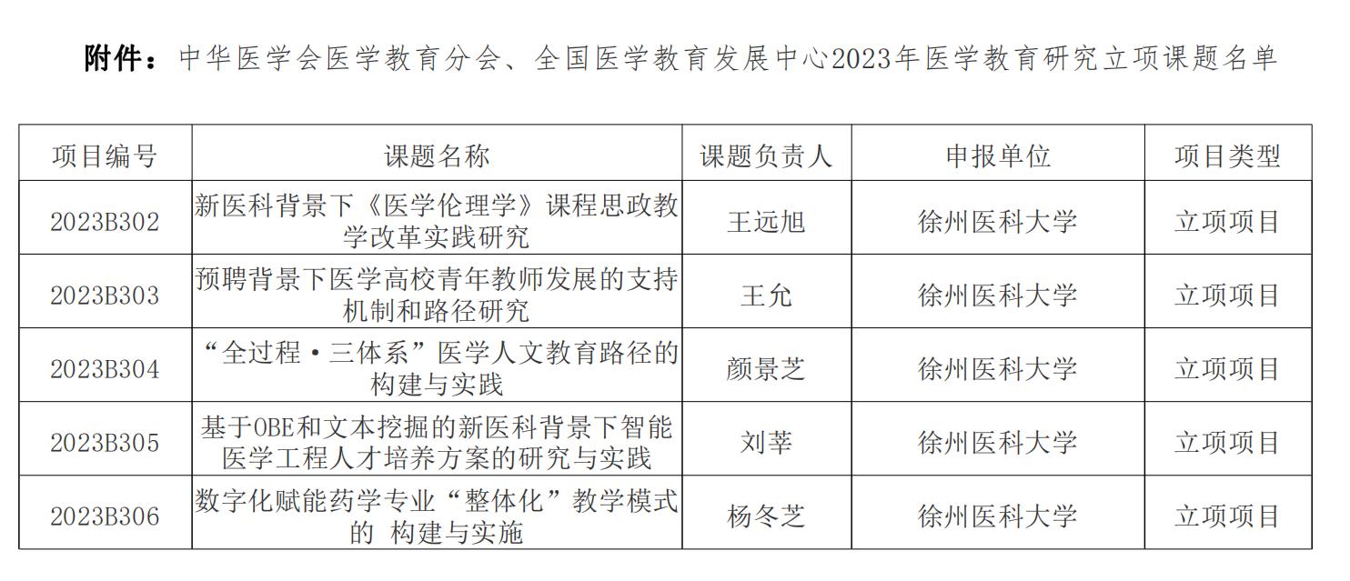 近日,中华医学会医学教育分会、全国医学教育发展中心发布2023年度医学教育研究课题项目评审结果,捕鱼达人 5项课题获批立项。本次申报,全国132所医捕鱼达人 校及各专业委员会共申报1032项,最终417项申报课题予以立项。