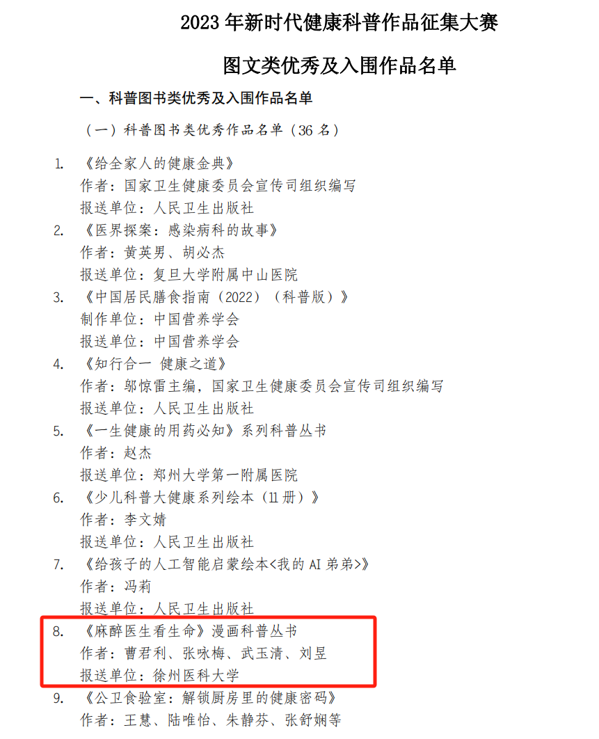 近日,国家卫生健康委、科技部、国家中医药局、国家疾控局、中国科协共同组织开展了“健康知识普及行动—2023年新时代健康科普作品征集大赛”。经过省级初审、推荐,各类别专家组复审、终审,麻醉捕鱼达人 报送的《麻醉医生看生命》漫画科普丛书最终脱颖而出,获得科普图书类优秀作品(全国共遴选36项)。