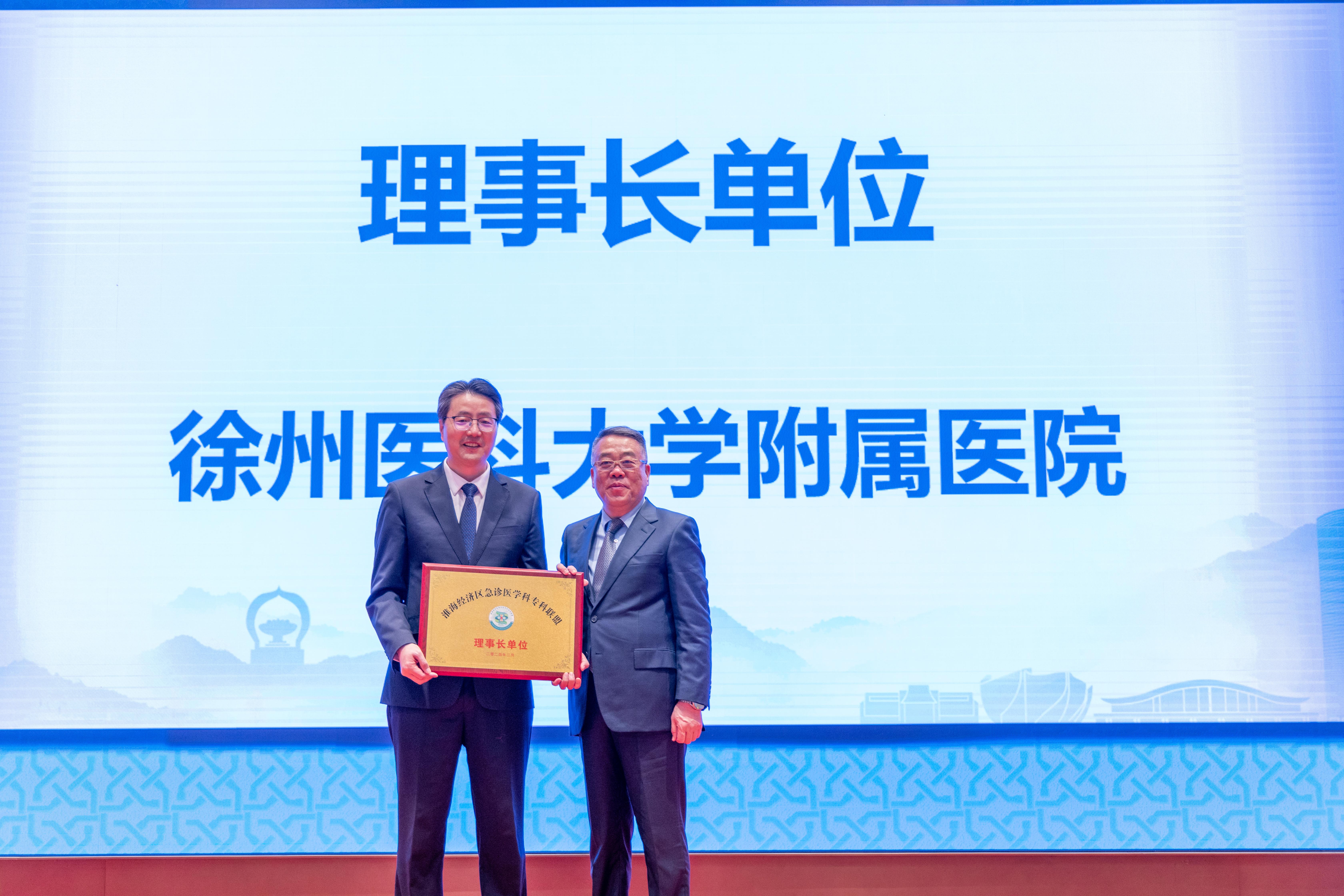 国家卫健委医疗应急司医疗应急指导处处长刘文、邱晓辉、曹永、中华医学会急诊医学分会主任委员吕传柱、江苏省卫生应急研究所所长许铁共同为“淮海经济区急诊医学科专科联盟”揭牌,并为14家联盟理事长、副理事长单位进行授牌。