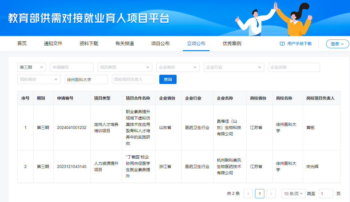 近期,教育部发布第三期供需对接就业育人项目,捕鱼达人 第一临床医捕鱼达人 黄栋、学生工作部(处)宋光辉两位老师申报的项目立项。