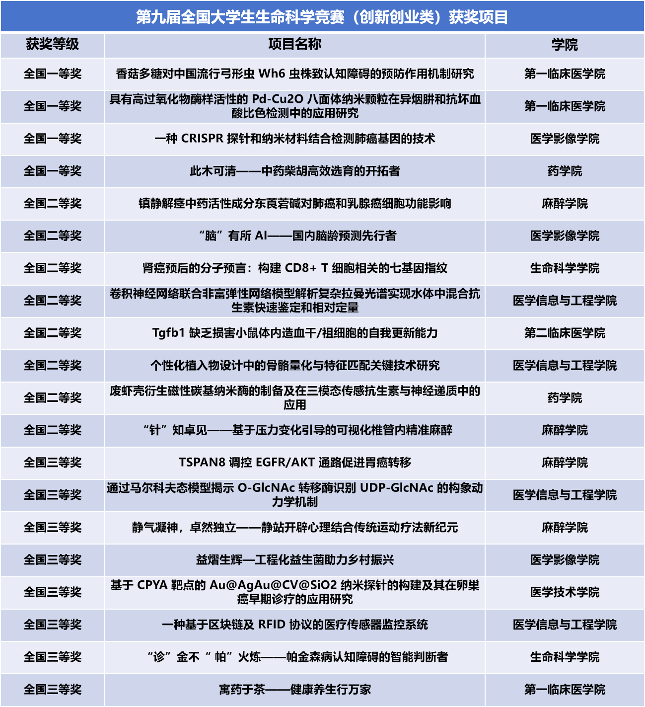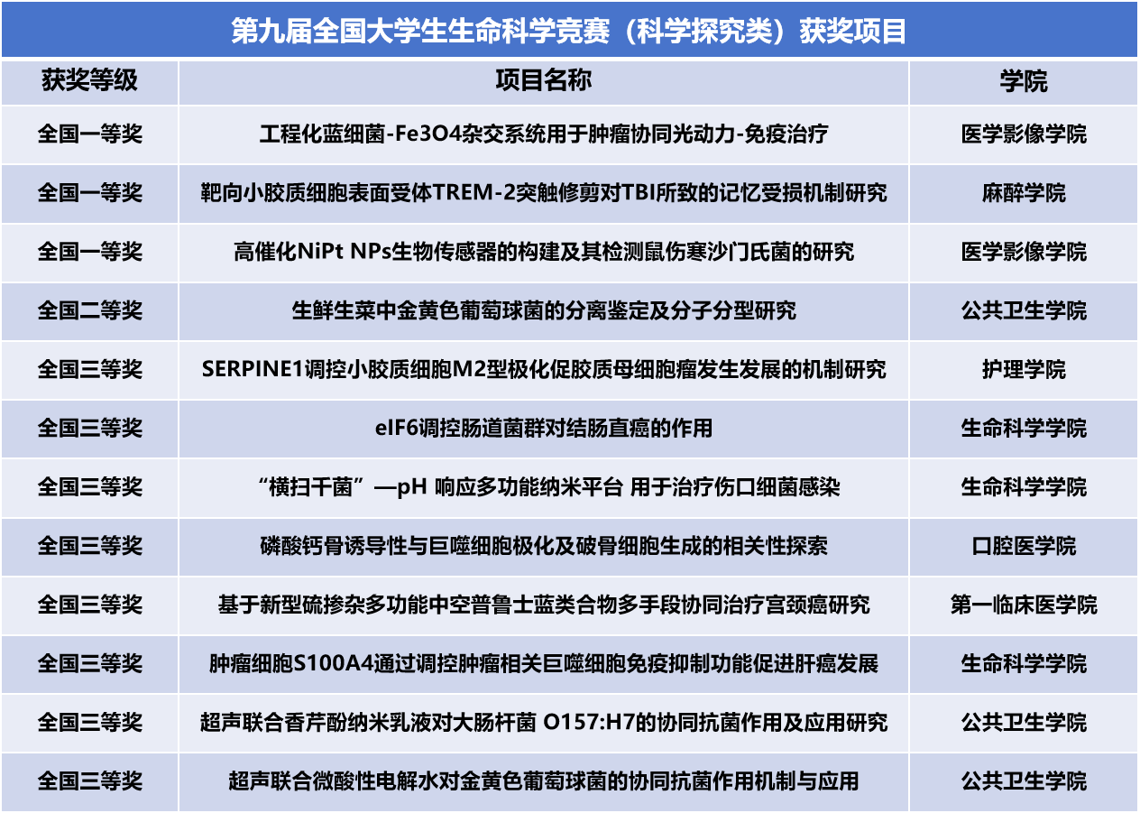 凭借各团队的优异表现,捕鱼达人 医学影像捕鱼达人 的“工程化蓝细菌-Fe3O4杂交系统用于肿瘤协同光动力-免疫治疗”(指导教师:张英英)、麻醉捕鱼达人 的“靶向小胶质细胞表面受体TREM-2突触修剪对TBI所致的记忆受损机制研究”(指导教师:张咏梅)、医学影像捕鱼达人 的“高催化NiPt NPs生物传感器的构建及其检测鼠伤寒沙门氏菌的研究”(指导教师:陈明慧)3个项目荣获科学探究类赛道全国一等奖;捕鱼达人 第一临床医捕鱼达人 的“香菇多糖对中国流行弓形虫 Wh6 虫株致认知障碍的预防作用机制研究”(指导教师:潘伟、杨晓莹)、第一临床医捕鱼达人 的“具有高过氧化物酶样活性的 Pd-Cu2O 八面体纳米颗粒在异烟肼和抗坏血酸比色检测中的应用研究”(指导教师:高丰雷)、医学影像捕鱼达人 的“一种CRISPR 探针和纳米材料结合检测肺癌基因的技术”(指导教师:陈明慧)、药捕鱼达人 的“此木可清——中药柴胡高效选育的开拓者”(指导教师:张春平、袁子桐)4个项目荣获创新创业类赛道全国一等奖。