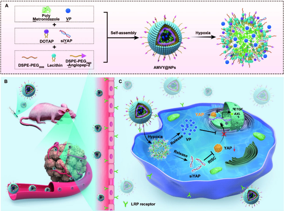 据此,本研究以 Angiopep-2(A)作为靶头、脂质-聚甲硝唑(M)作为疏水内核,包载 YAP抑制剂Verteporfin(V)和siYAP(Y),形成双级脑靶向且具有缺氧响应特性的纳米药物 AMVY@NPs,实现同时靶向递送VP 和siYAP治疗脑胶质瘤。该纳米药物在Angiopep-2的靶向作用下通过血脑屏障并到达脑胶质瘤,聚甲硝唑在脑胶质瘤的缺氧微环境中发生响应性裂解,释放VP和siYAP,从核酸和蛋白水平抑制YAP的水平与活性,起到精准、高效治疗脑胶质瘤的作用。AMVY@NPs不仅治疗效果好,且具有良好的生物安全性,可能为将来脑胶质瘤的分子靶向治疗提供一种有价值的纳米药物和递送系统。