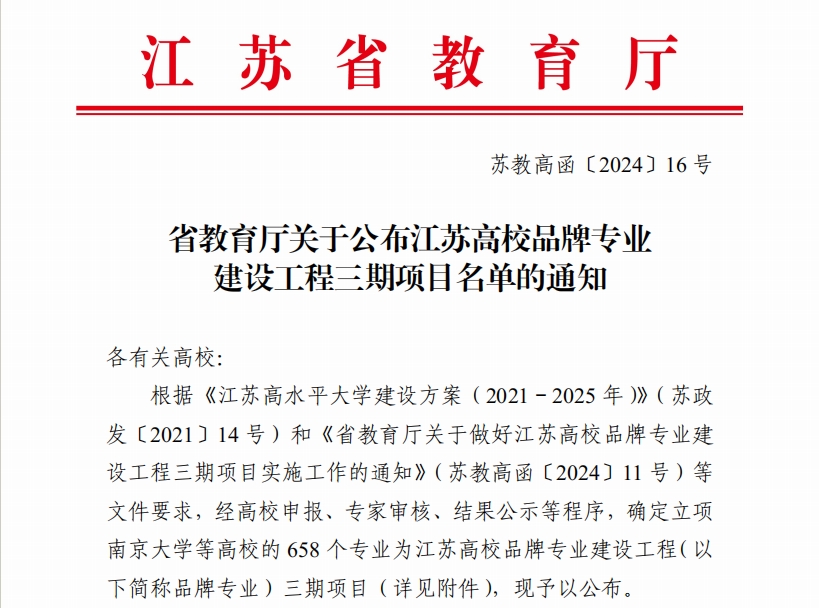 江苏高校品牌专业建设工程三期项目由省教育厅实施,旨在聚焦国家重大战略和江苏经济社会高质量发展需求,为高标准建设高等教育强省奠定坚实基础,为打造具有全球影响力的产业科技创新中心和因地制宜发展新质生产力提供有力支撑。