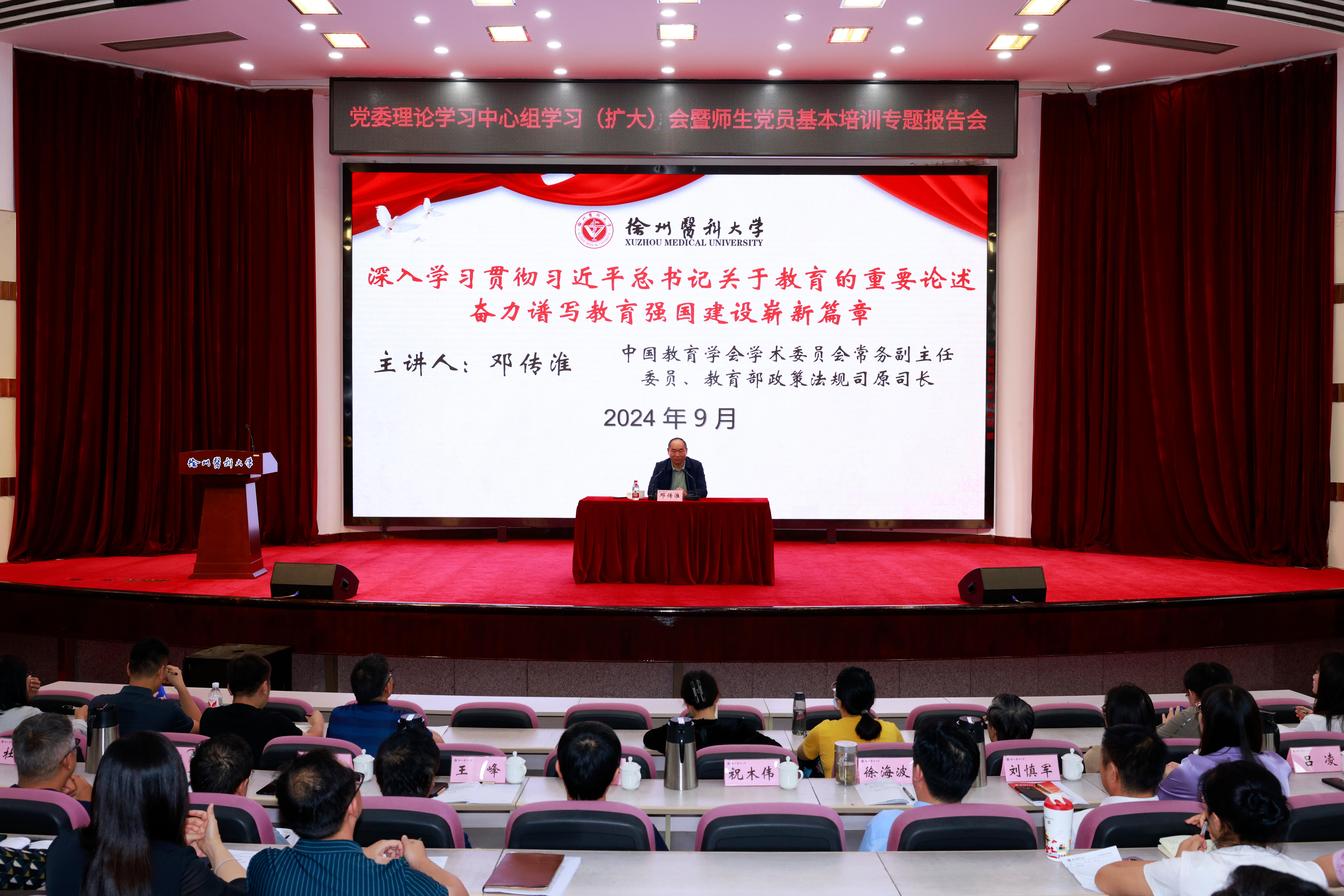 9月18日下午,捕鱼达人 党委召开党委理论学习中心组学习(扩大)会暨师生党员集中培训专题报告会,中国教育学会学术委员会常务副主任委员、教育部政策法规司原司长邓传淮作专题报告。校领导、中层干部、马克思主义捕鱼达人 教师和辅导员参加会议,校党委书记祝木伟主持会议。