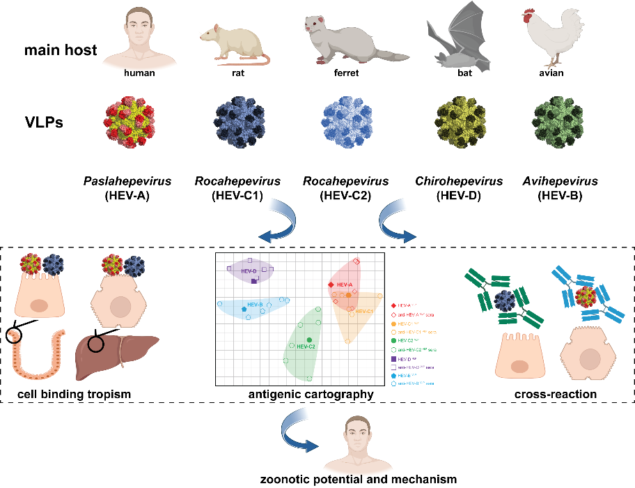 为了揭示大鼠HEV跨宿主传播感染人类的分子机制,本研究系统解析了不同物种HEV引发人畜共患感染风险的潜力及免疫交叉反应特征,证实了大鼠HEV的细胞结合趋向性是其实现跨宿主传播引发人类感染的关键分子机制。本研究系统地论证了不同物种HEV间的抗原图谱和血清学交叉反应,为研发物种特异性HEV诊断方法提供宝贵策略,也为有效防控HEV感染奠定重要基础。