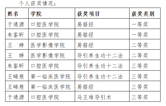 捕鱼达人 组队参加本次赛事,在运动员与教练员的共同努力下,荣获集体赛易筋经二等奖、导引养生功十二法二等奖;荣获个人赛易筋经一等奖2项(男子组1项、女子组1项)、二等奖1项(女子组)、三等奖1项(女子组),导引养生十二功法二等奖1项、三等奖2项(女子组),马王堆导引术三等奖1项(男子组)。