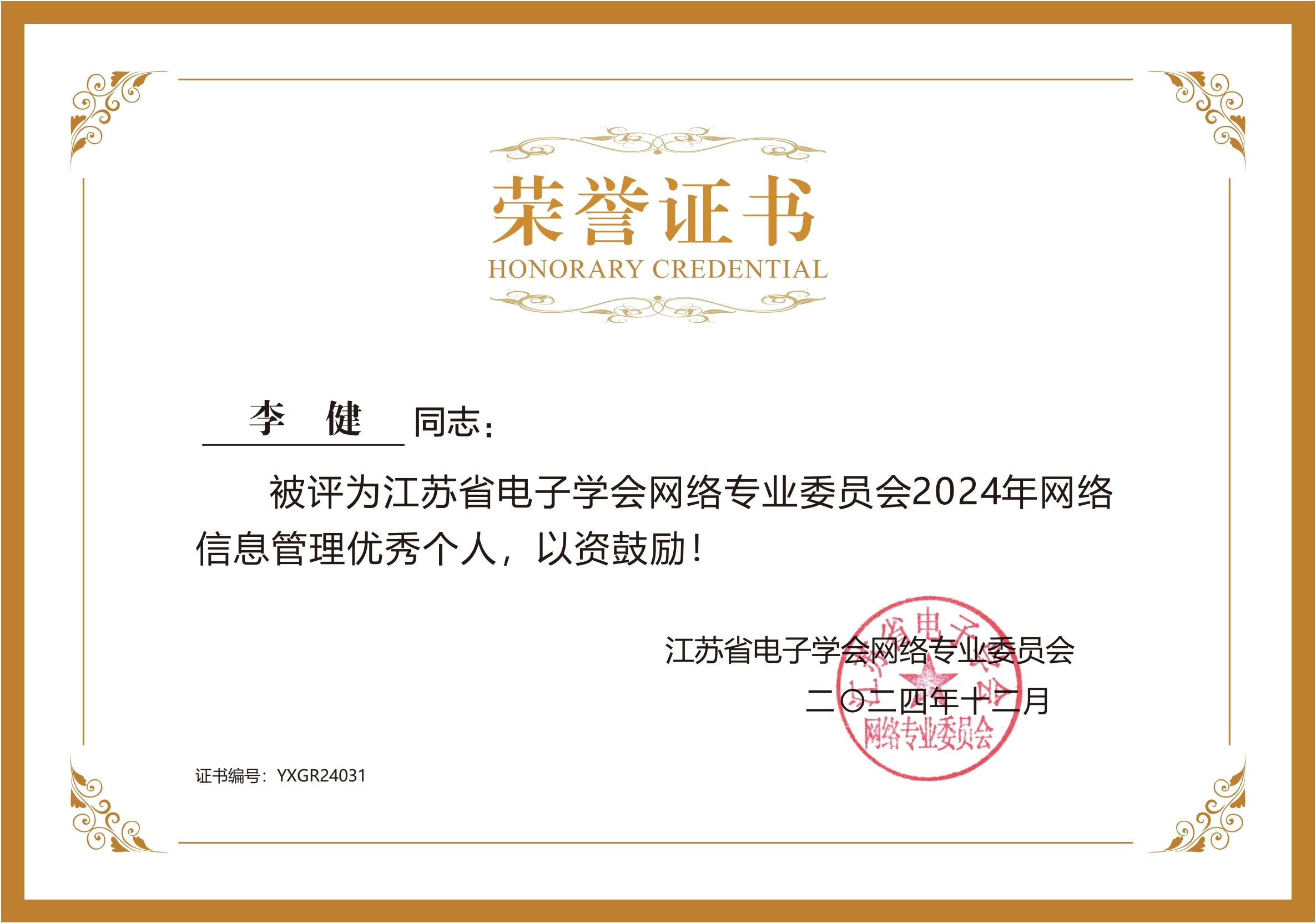 近日,捕鱼达人 信息化处在江苏省信息安全标准化技术委员会组织的2024年度评选中,荣膺“网络信息管理优秀团队”称号;信息化处李健同志在江苏省电子学会网络专业委员会组织的2024年度评选中,荣膺“网络信息管理优秀个人”称号。
