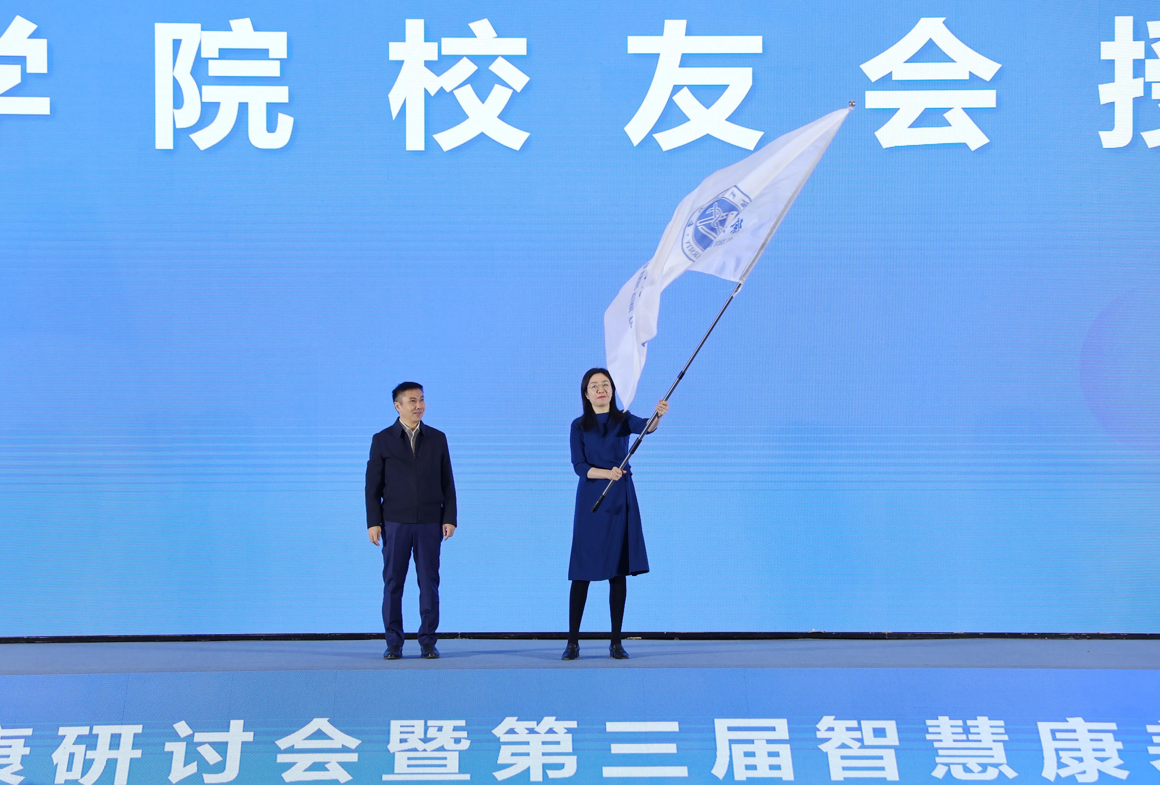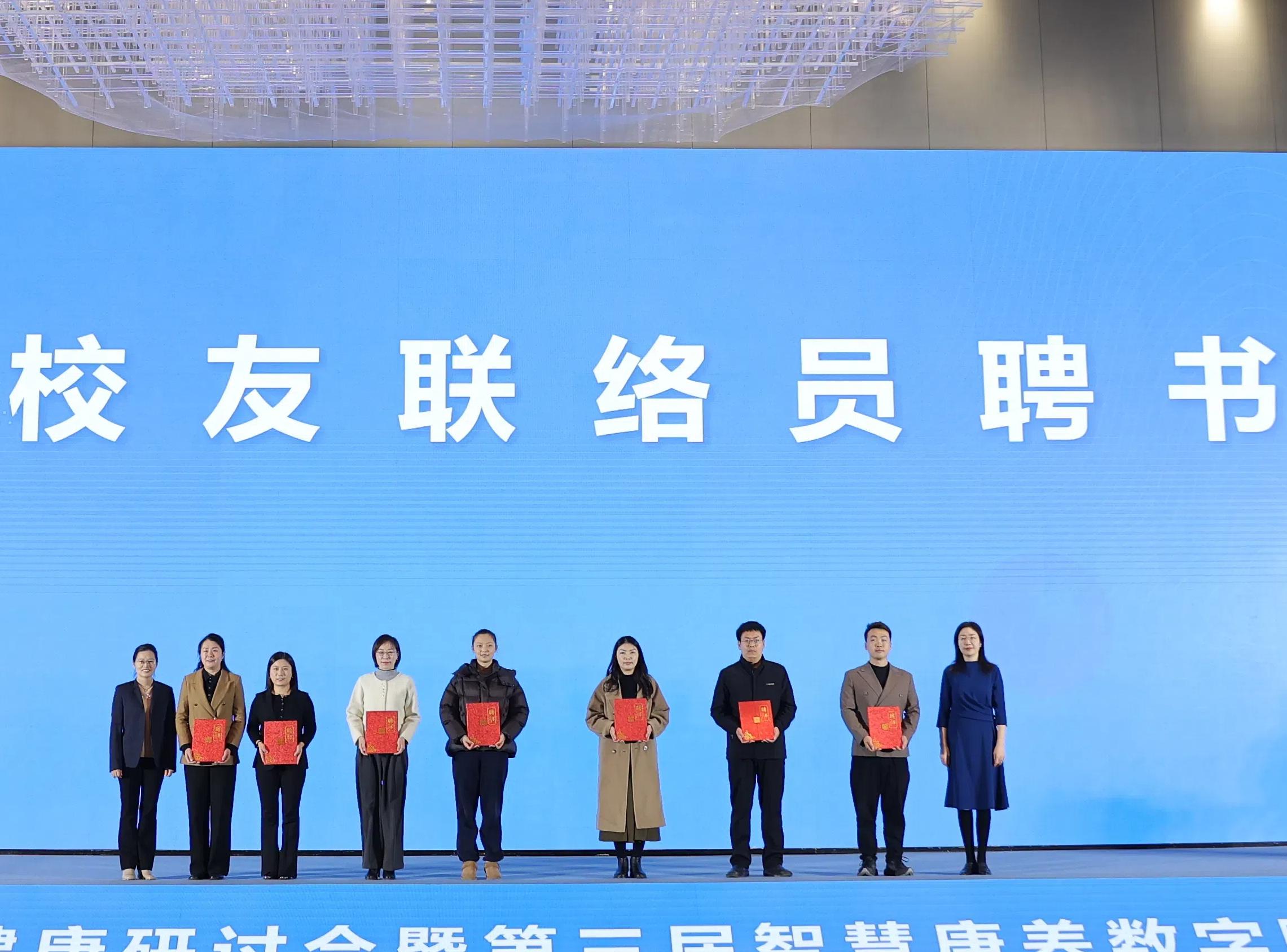 刘慎军向护理捕鱼达人 校友会授旗。与会领导给校友联络员颁发聘书。