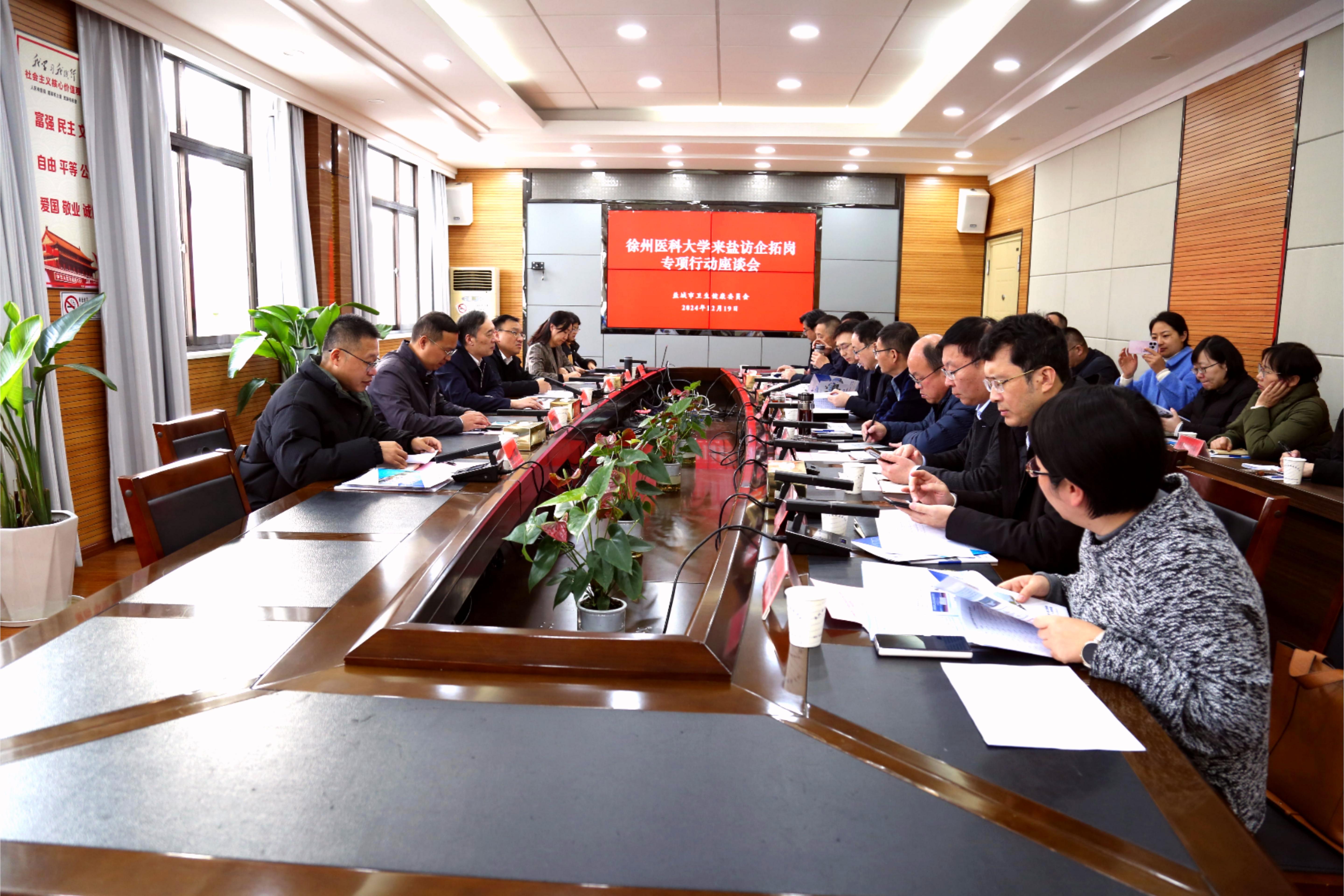 盐城卫健委党委书记、主任王正对捕鱼达人 长期以来为盐城医疗卫生系统输送大量医学人才表示感谢,希望双方在教学科研合作、卫生人才培养、医疗服务提升等方面进一步加强交流,实现校地共赢。祝木伟对盐城卫健委多年来大力支持捕鱼达人 就业工作表示感谢,介绍了捕鱼达人 人才培养和专业建设情况,强调要以“访企拓岗促就业”为契机,持续深化合作,推动资源共建共享,为校地双方高质量发展赋能增效,共同培养优秀医学人才,为“健康中国”建设贡献力量。参会人员围绕学科专业优化、创新人才培养、科创平台建设、岗位编制管理等进行充分讨论交流。