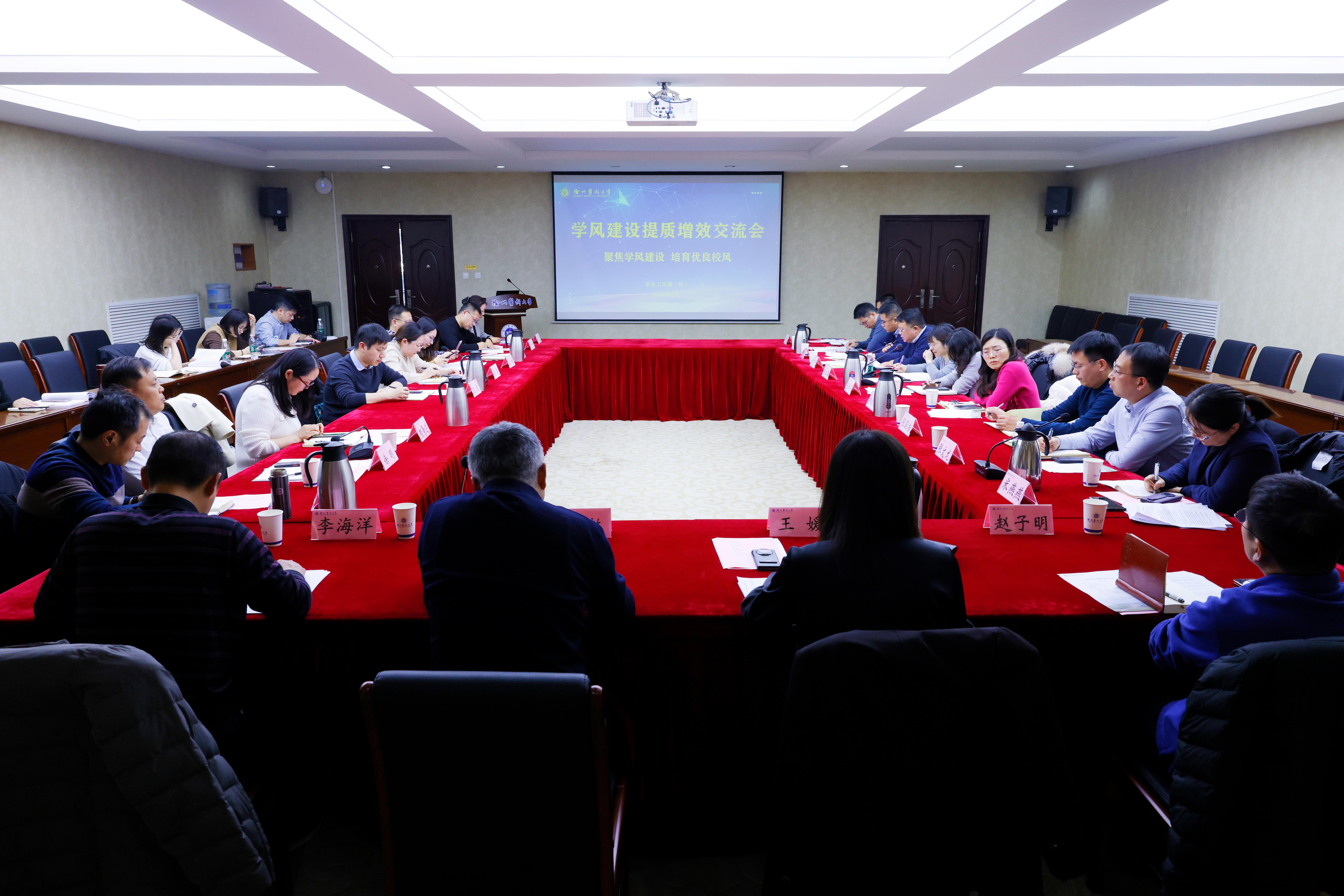 学工部、研工部部长李海洋以“关于学风建设的几点思考”为题,剖析了加强学风建设的重要意义;结合当代大学生的思想与行为特点,介绍了打造“学在徐医”品牌的思路和举措。各捕鱼达人 学生工作负责人汇报了前期学风调研情况,通过翔实数据和案例分析了学生日常管理与学风建设相关问题,并提出促进学风建设提质增效的具体意见和建议。教务处副处长赵子明对捕鱼达人 学生学习体验与成长评价报告作了解读,阐述了教风与学风相辅相成的紧密关系,并就如何推动教学改革创新分享了思考和体会。