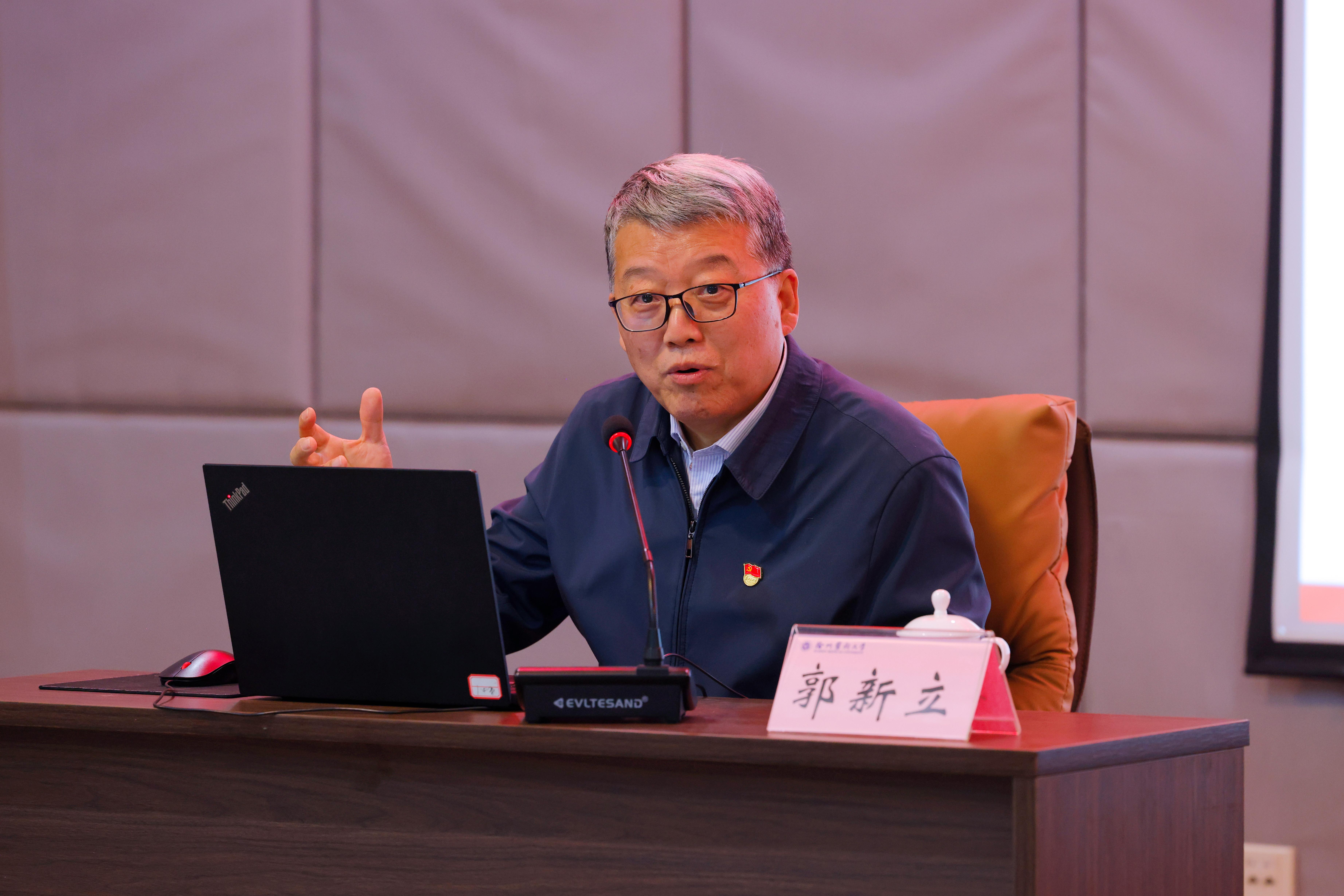 会议邀请山东大学原党委书记郭新立教授作专题辅导报告,主题为“以高质量党建引领中国特色世界一流大学建设”。郭新立从“以高质量党建引领中国特色世界一流大学建设的逻辑脉络”“探索‘一融双高’的方法路径”和“以高质量党建解决好中国特色世界一流大学建设的思想、道路、治理、生态问题”三个方面,作了一场主题鲜明、内容丰富、逻辑严密、立意深远的报告。郭教授结合长期从事教育政府主管部门的经历、丰富的基层高校试点经验和山东大学的具体实践,对“一融双高”的四个具体方法路径,即用好习近平新时代中国特色社会主义思想的“金钥匙”,把牢党对教育工作的全面领导的“定盘星”,破解重形式轻内容、重过程轻结果、重数量轻质量的“两张皮”问题和团结奋斗拧成“一股绳”做了全面详细的介绍,总结了在建设中国特色世界一流大学过程中的工作经验。