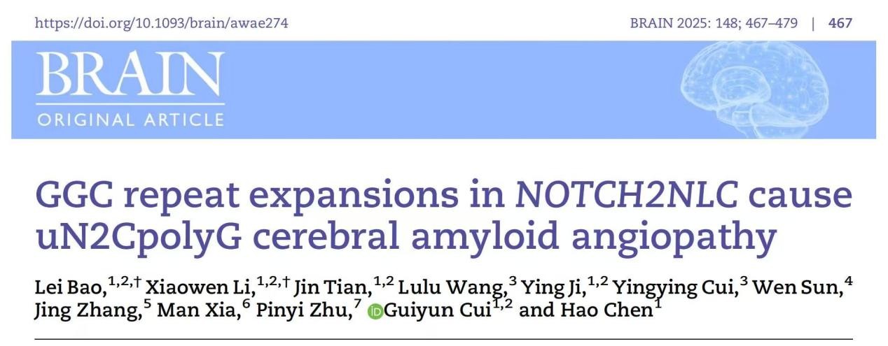 在捕鱼达人 及附属医院领导的支持帮助下,2025 年 2 月,捕鱼达人 附属医院崔桂云和陈浩教授团队取得重大科研突破。其研究成果以论著形式,在线发表于国际神经病学领域的顶刊 ——《Brain》,论文题目为 “GGC Repeat Expansions in NOTCH2NLC Cause uN2CpolyG Cerebral Amyloid Angiopathy”,属于原创性研究成果。在这篇论文中,捕鱼达人 附属医院崔桂云教授和陈浩副教授为并列通讯作者,鲍磊博士和李晓文硕士为共同第一作者,捕鱼达人 附属医院既是第一单位,也是第一通讯单位。