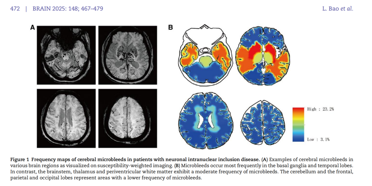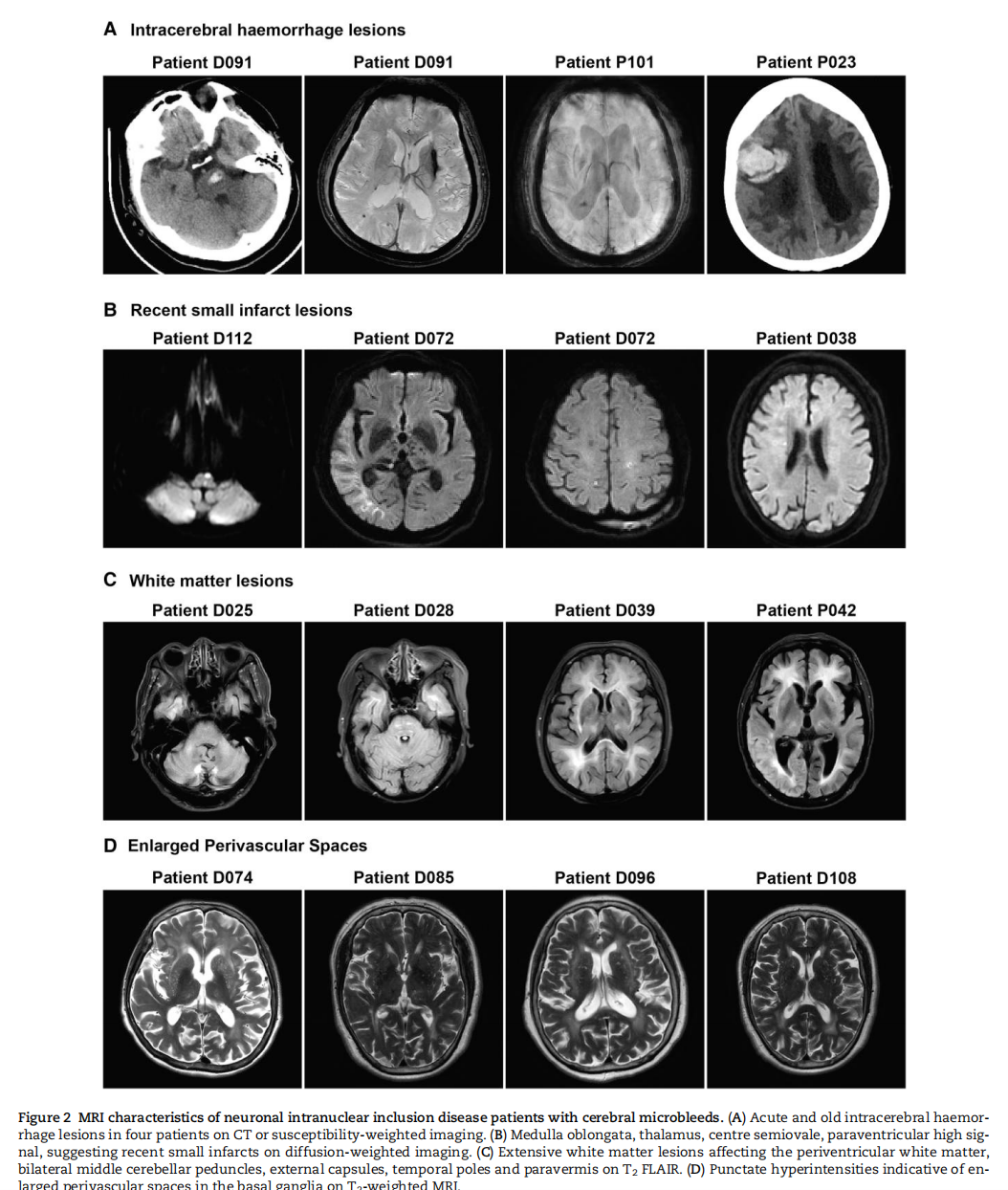 该研究成果显示,NOTCH2NLC 基因 GGC 重复扩增会使其翻译出富含甘氨酸的蛋白质 uN2CpolyG。这种蛋白质不仅会在神经元内聚集形成包涵体,还能沉积在血管壁形成淀粉样物质,导致患者出现进行性认知功能障碍、多发脑微出血、反复皮层下梗死、关键脑区白质病变(外囊、颞极)、脑叶出血等症状。这一发现有助于解释神经元核内包涵体病患者特有的一些临床表现,像卒中样发作、癫痫发作、偏头痛发作、脑炎样发作等,这些症状实际上可能是由脑血管淀粉样变引起的短暂性局灶性神经系统发作(TFNE),即 “淀粉样发作(amyloid spells)”。