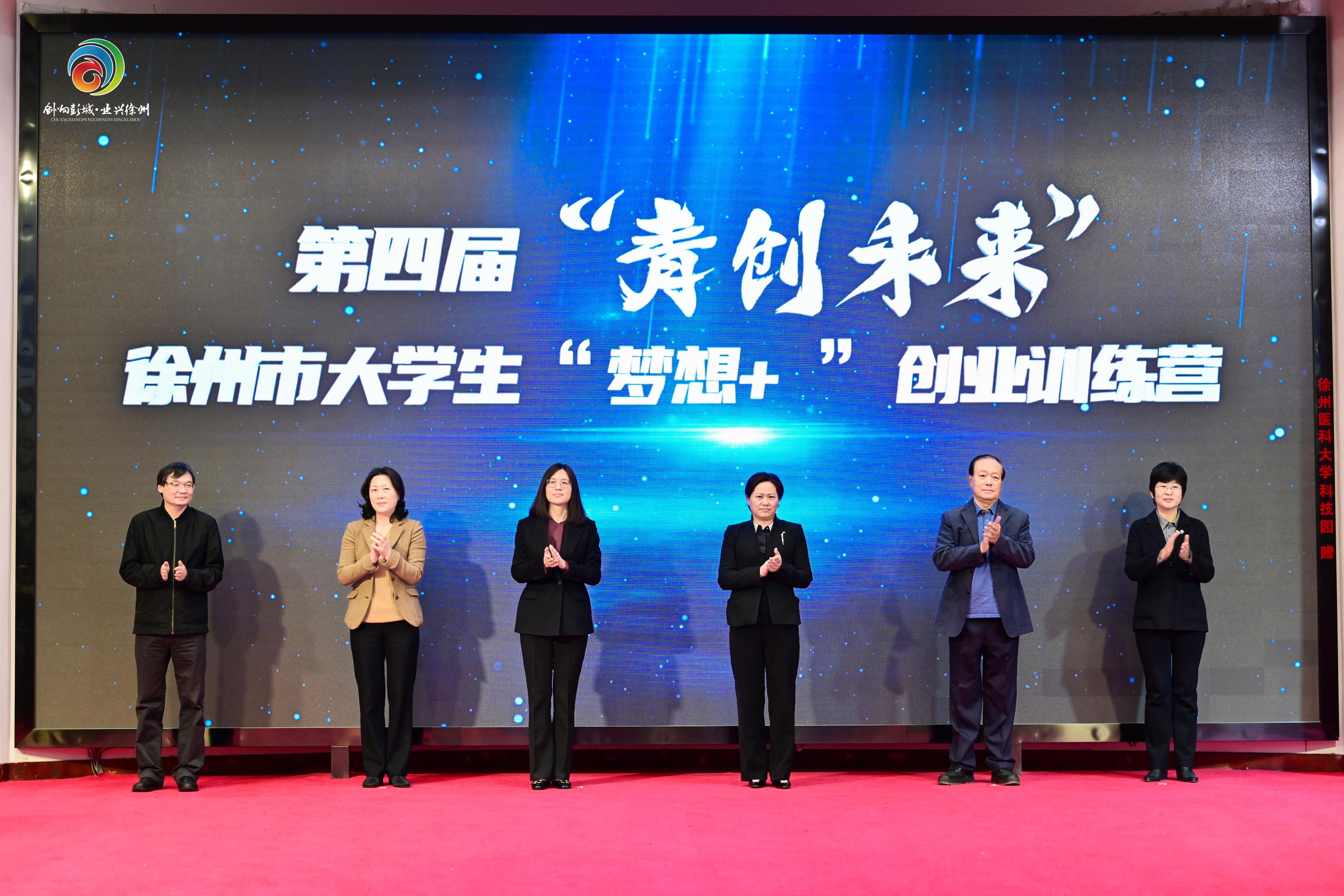 与会领导嘉宾登台,共同启动第四届“青创未来”徐州市大学生“梦想+”创业训练营序幕。