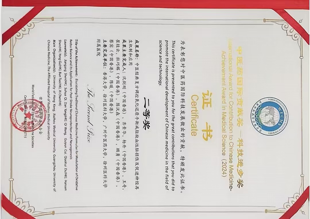 近日,捕鱼达人 医学技术捕鱼达人 齐素华教授团队与香港大学沈剑刚教授团队合作的科研项目《中医药调控氧化还原平衡减轻缺血性脑损伤及促神经再生机制和应用》荣获2024年度中医药国际贡献奖——科技进步二等奖(捕鱼达人 排名第二,香港大学排名第一)。该奖项目前是中医药领域的最高奖项,标志着捕鱼达人 在中医药治疗脑卒中领域取得重大成果,也展现了我国在治疗脑卒中领域的领先地位。