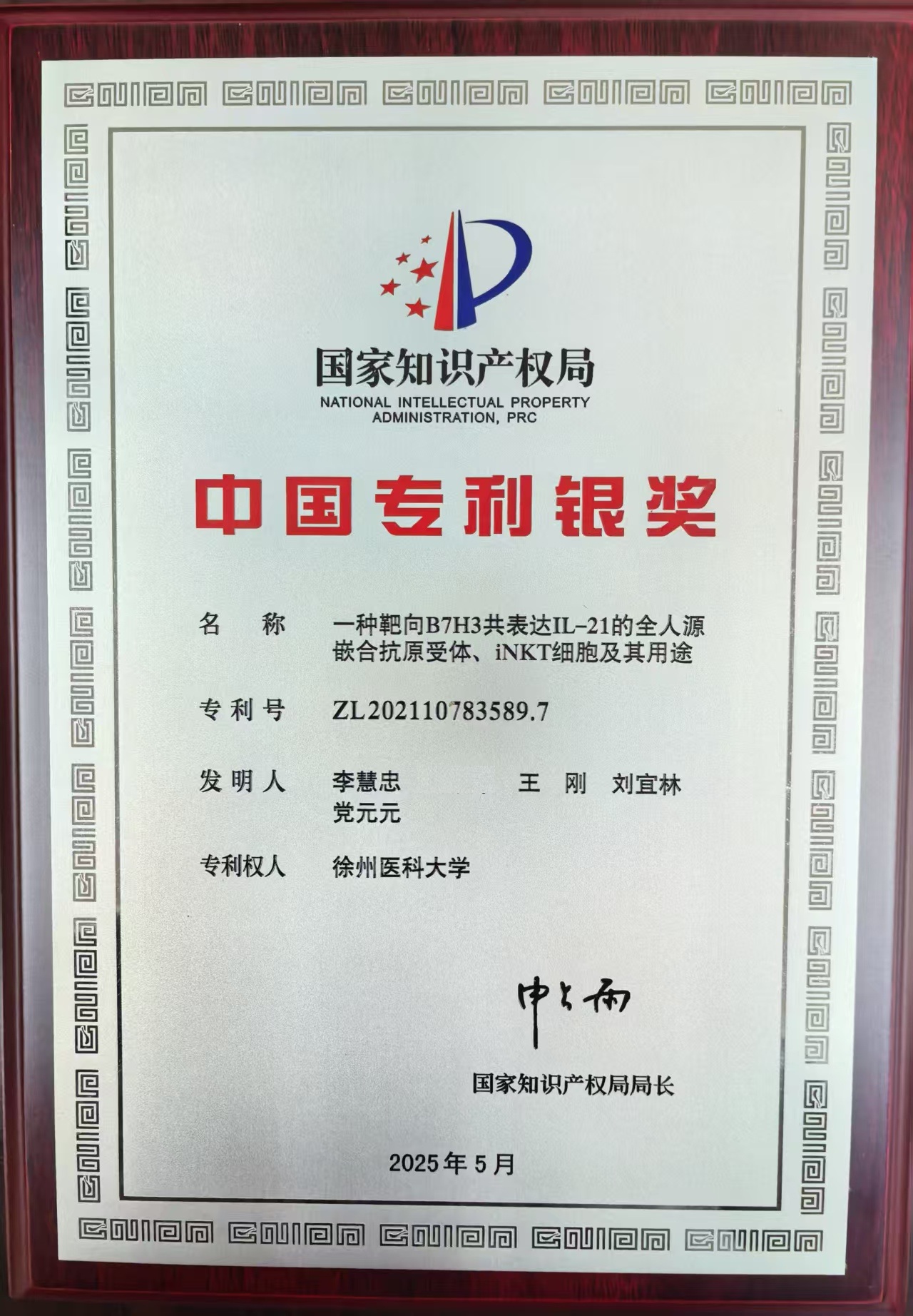 10月13日,第二十五届中国专利奖颁奖大会在大连举行。此次共有30项专利获颁中国专利金奖,10项外观设计专利获中国外观设计金奖,60项专利获颁中国专利银奖,607项专利获颁中国专利优秀奖。捕鱼达人 授权专利“一种靶向B7H3共表达IL-21的全人源嵌合抗原受体、iNKT细胞及其用途”,荣获中国专利银奖。中国专利银奖60项,高校项目仅12项,捕鱼达人 为医药类唯一高校。