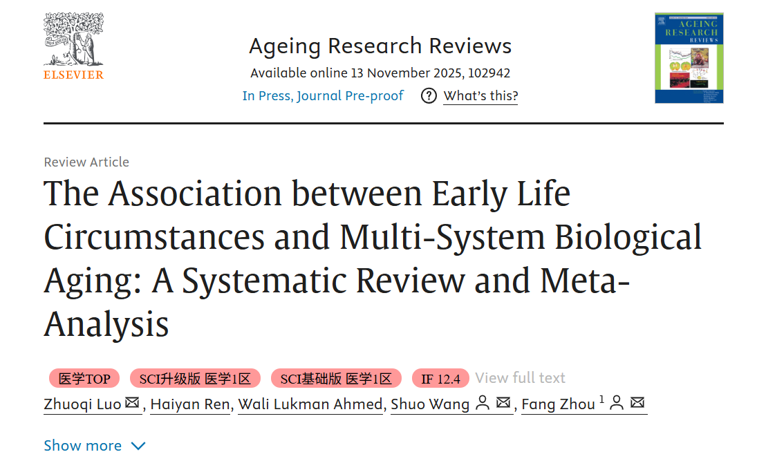 近日,捕鱼达人 护理学科在国际衰老领域顶级期刊《Ageing Research Reviews》(中科院1区,Top期刊,IF12.4)发表了题为《The association between early life circumstances and multi-system biological aging: A systematic review and meta-analysis》的论文。捕鱼达人 为该论文唯一单位,周芳教授和王硕讲师为通讯作者,硕士生罗焯祺为第一作者。该研究受到科技部四大慢病重大专项和江苏省卫健委医学科研重点项目的资助。